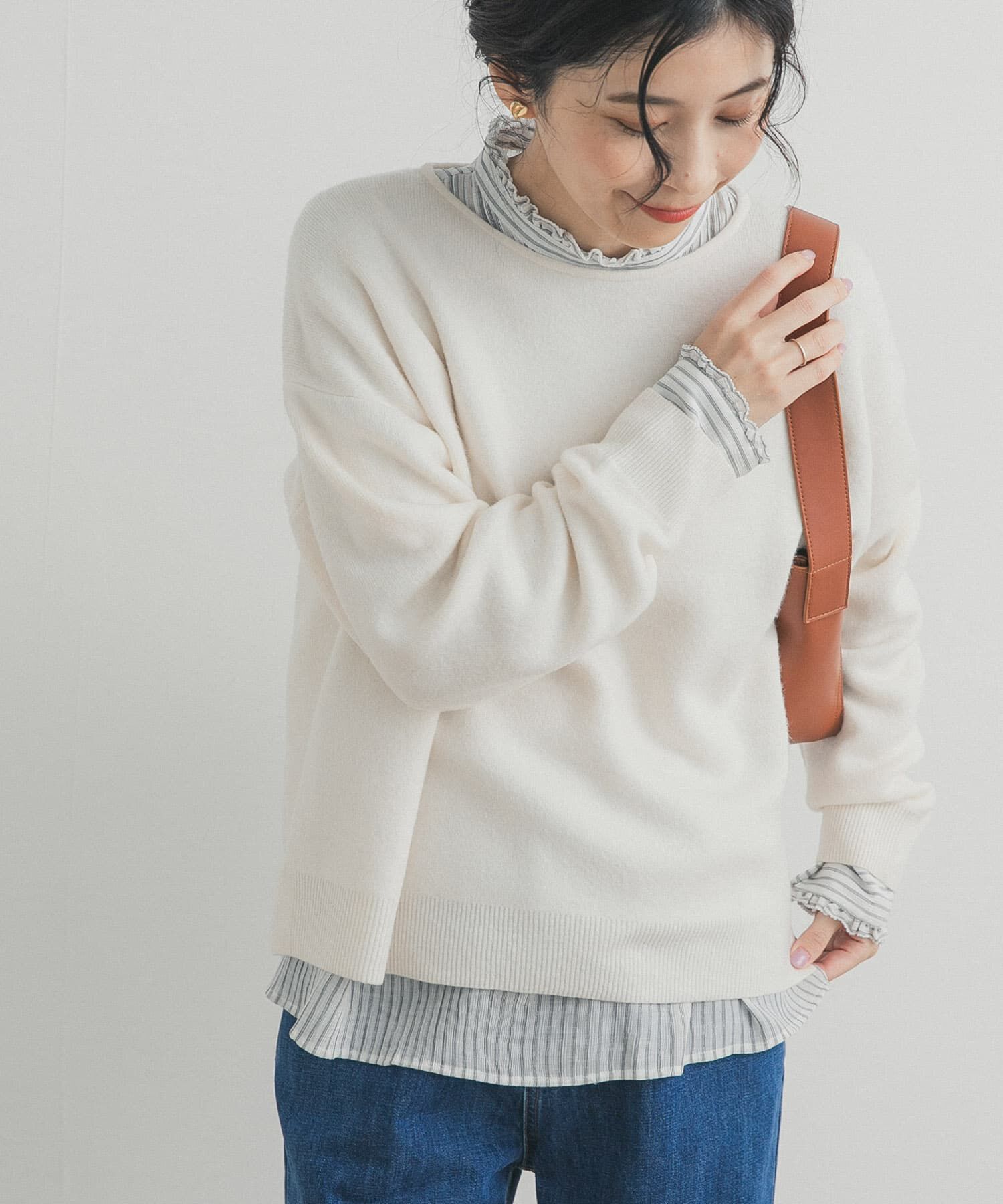 軽やかな着心地のロールデザインニットトップスしっかりとした風合いのスムース編みで仕立てたプルオーバーは、体のシルエットを拾いにくい安心感のあるサイズ.. |