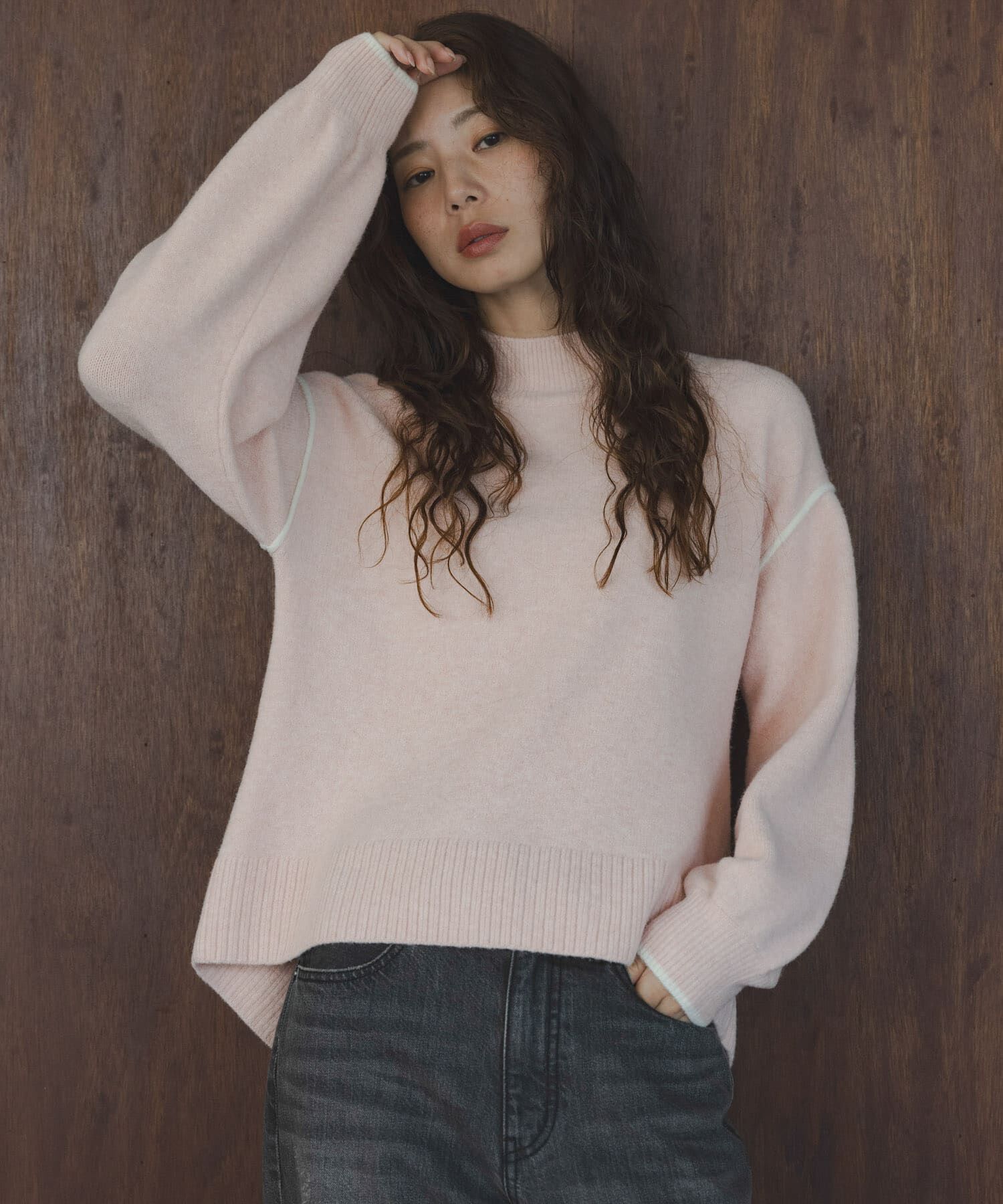 さりげない配色のシームデザインがポイントの万能ニットプルオーバーどんなボトムスのシルエットともバランス良く着こなせる、さりげない配色シームデザインと.. |