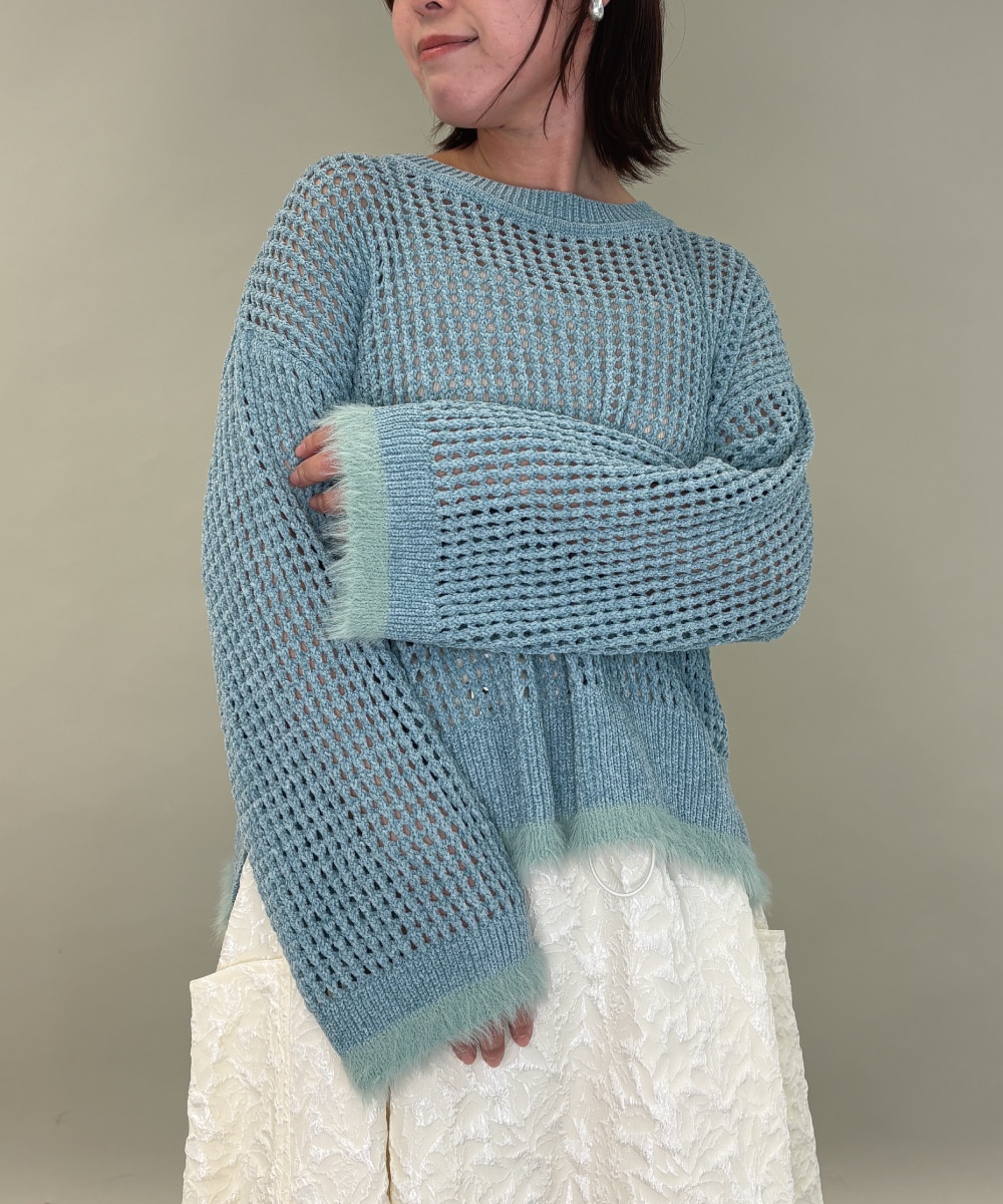 al’aise modulation(アレーズモジュレーション) 【洗える】ファーアクセントメッシュニットプルオーバー ライトブルー/青 38