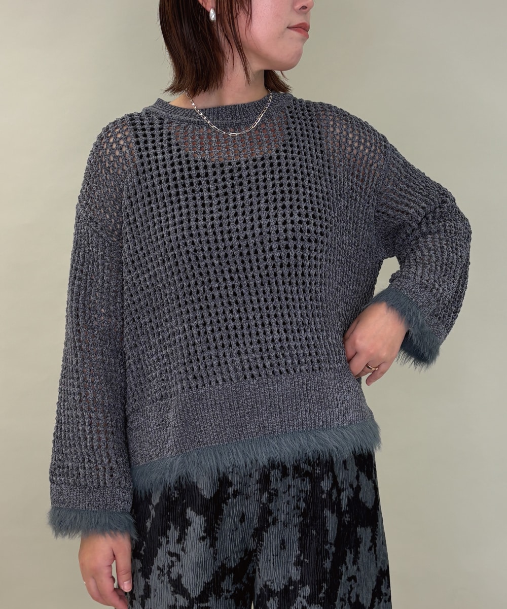 al’aise modulation(アレーズモジュレーション) 【洗える】ファーアクセントメッシュニットプルオーバー ダークグレー/灰 38
