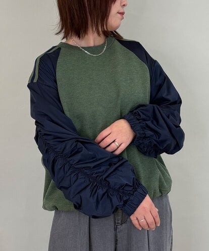 al’aise modulation(アレーズモジュレーション) 【洗える】異素材ジョイントギャザースリーブプルオーバー カーキ/緑 38