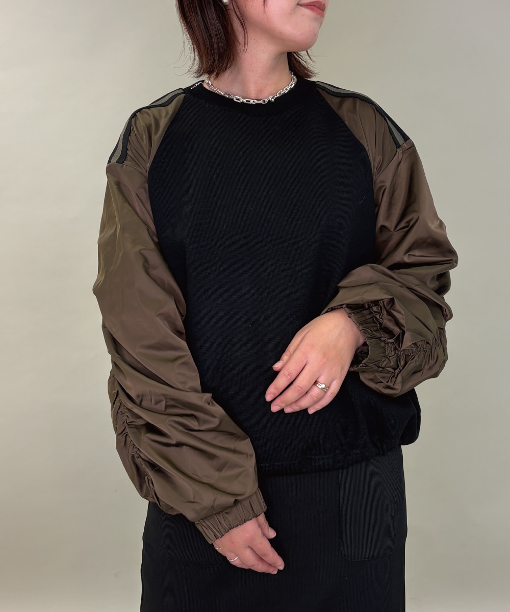 ・al'aise modulation・ 【デザイン】ナチュラルなニットと艶のある布帛素材を組み合わせたデザインプルオーバー。肩にラインテープと袖シャーリングを施し、.. |