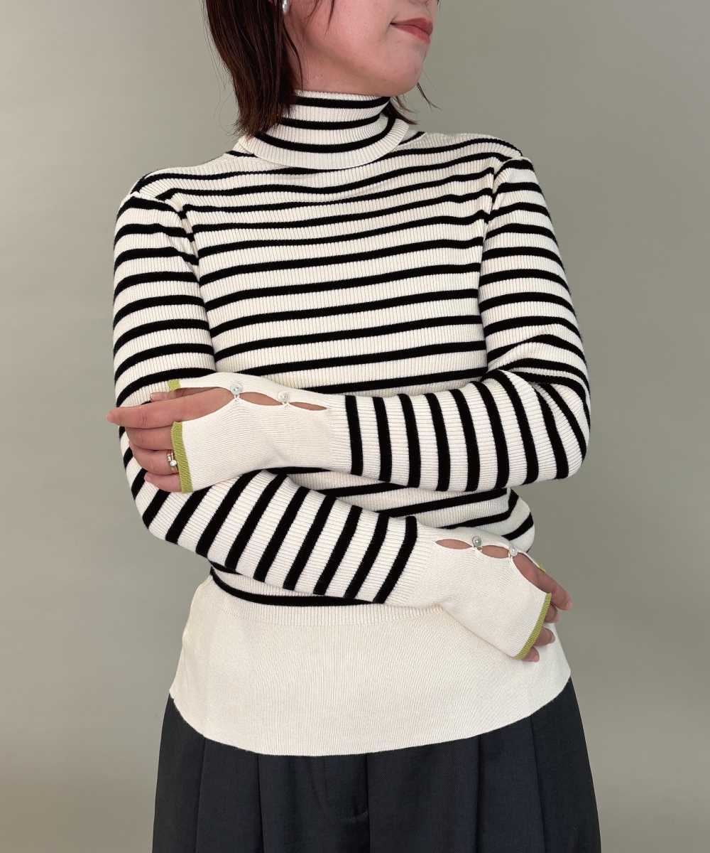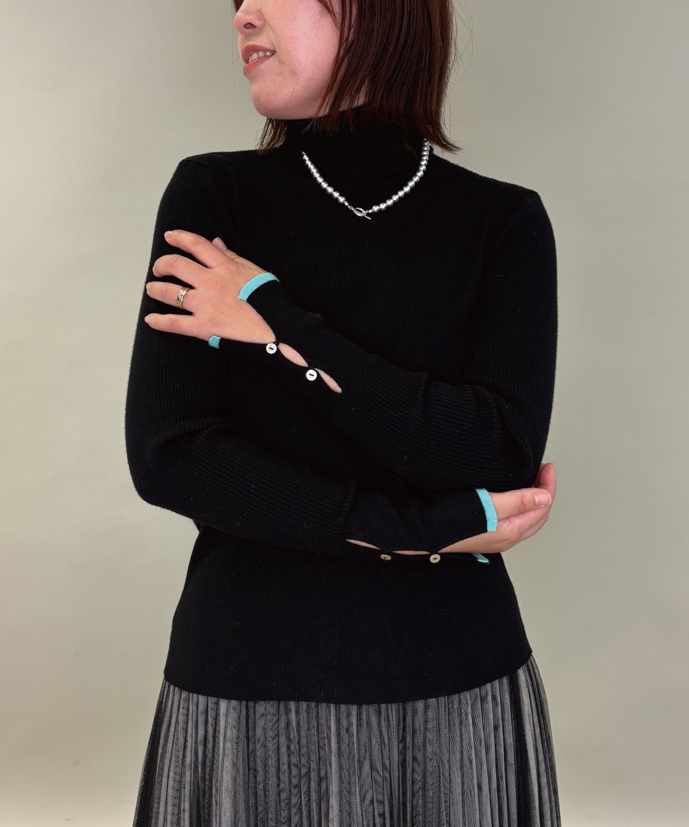 ・al'aise modulation・ 【デザイン】滑らかなリブ編みが魅力のタートルネックプルオーバー。シンプルながらも袖口のボタンや配色ラインデザインがさりげない.. |