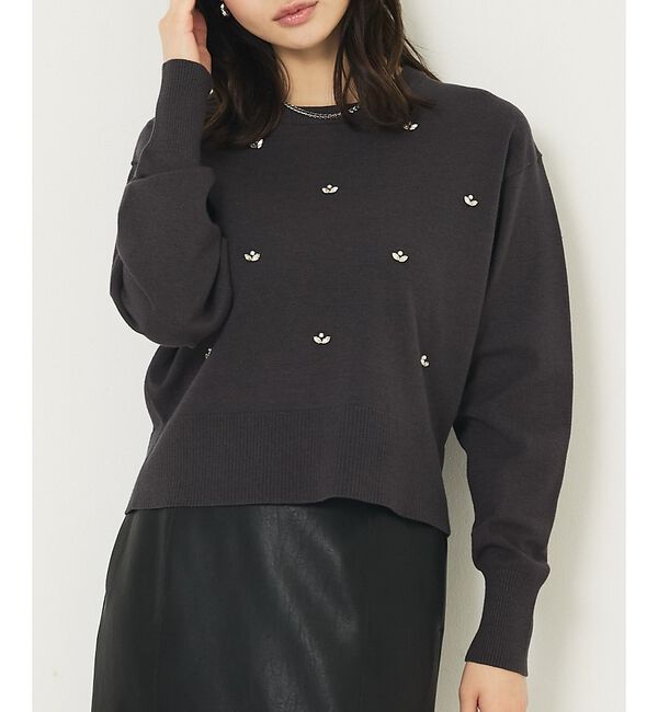 【Design】さりげないビジューが目を引くコンパクトなニットトップス。旬のスタイリングに使いやすいショート丈に仕上げ、コンパクトながらも、袖などはふんわ.. |