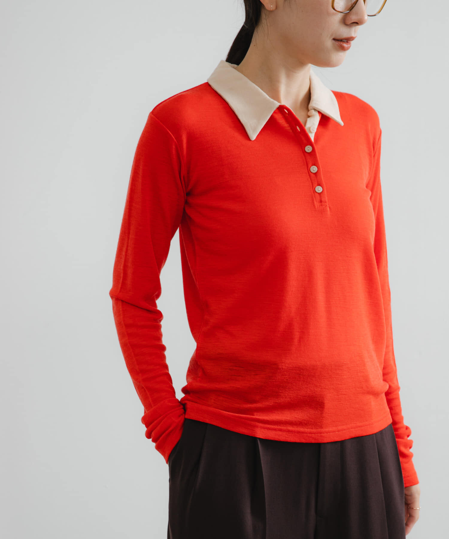 一点投入で華やぐ、ポロ衿トップス。柔らかなウールジャージー素材を使用したポロ衿トップスです。程よくフィットするコンパクトなシルエットが、身体のライン.. |