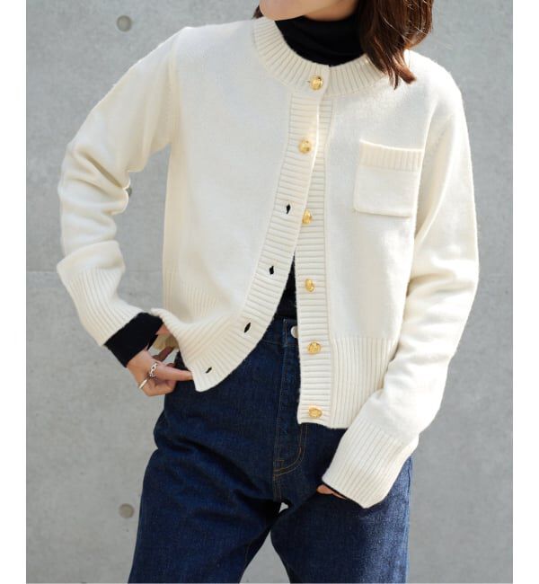 ウール混の紡毛糸をミドルゲージで程よい厚み感のニット素材。エンブレム柄入りのゴールドボタンが華やかなニットカーディガン。少し着丈短めのベーシックな程.. |