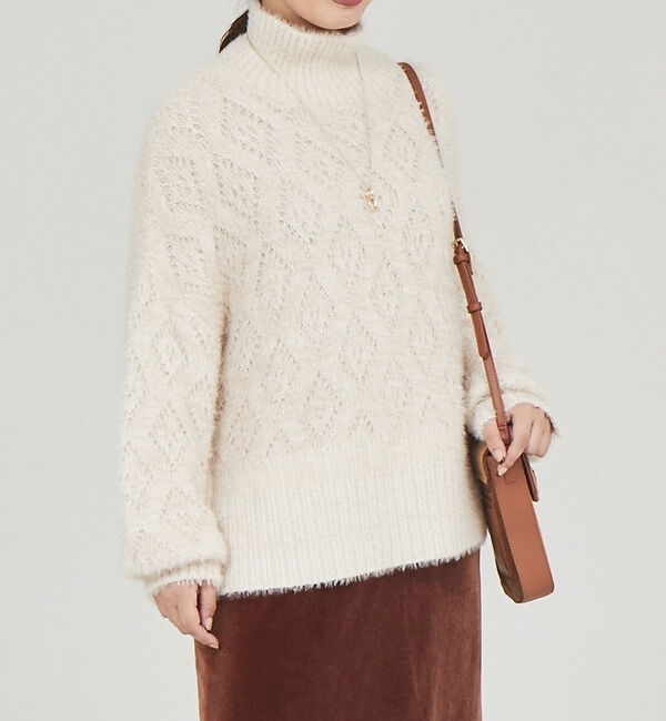 【Design】ふわふわのシャギー編みのタートルニット。ダイヤ柄の織柄が雰囲気をアップする1枚です。お袖も少し長めになっていて女心をくすぐる、ゆったり感が.. |