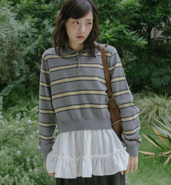 ■ポロ襟×マルチボーダーで韓国っぽ旬顔コーデに■トレンド感たっぷりのマルチボーダーがコーデの主役になるポロニットプルオーバー。襟付きのデザインでクラシ.. |
