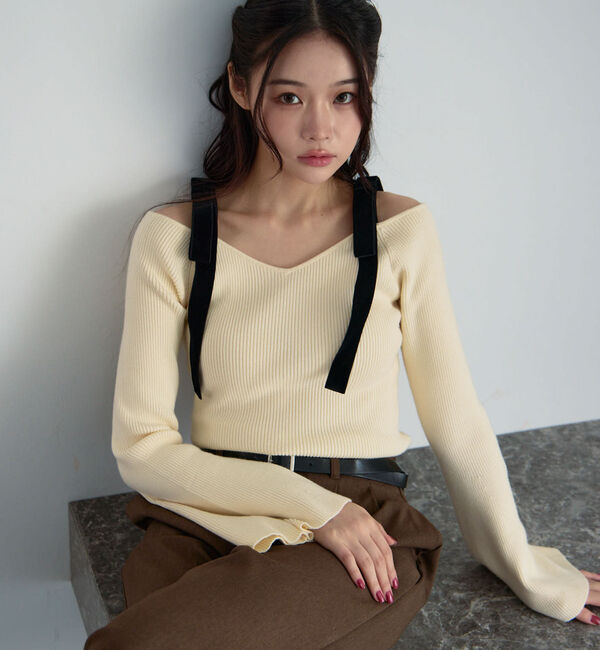 【アルシーヴ/archives】 ベロア肩リボンオフショルニットプルオーバー
