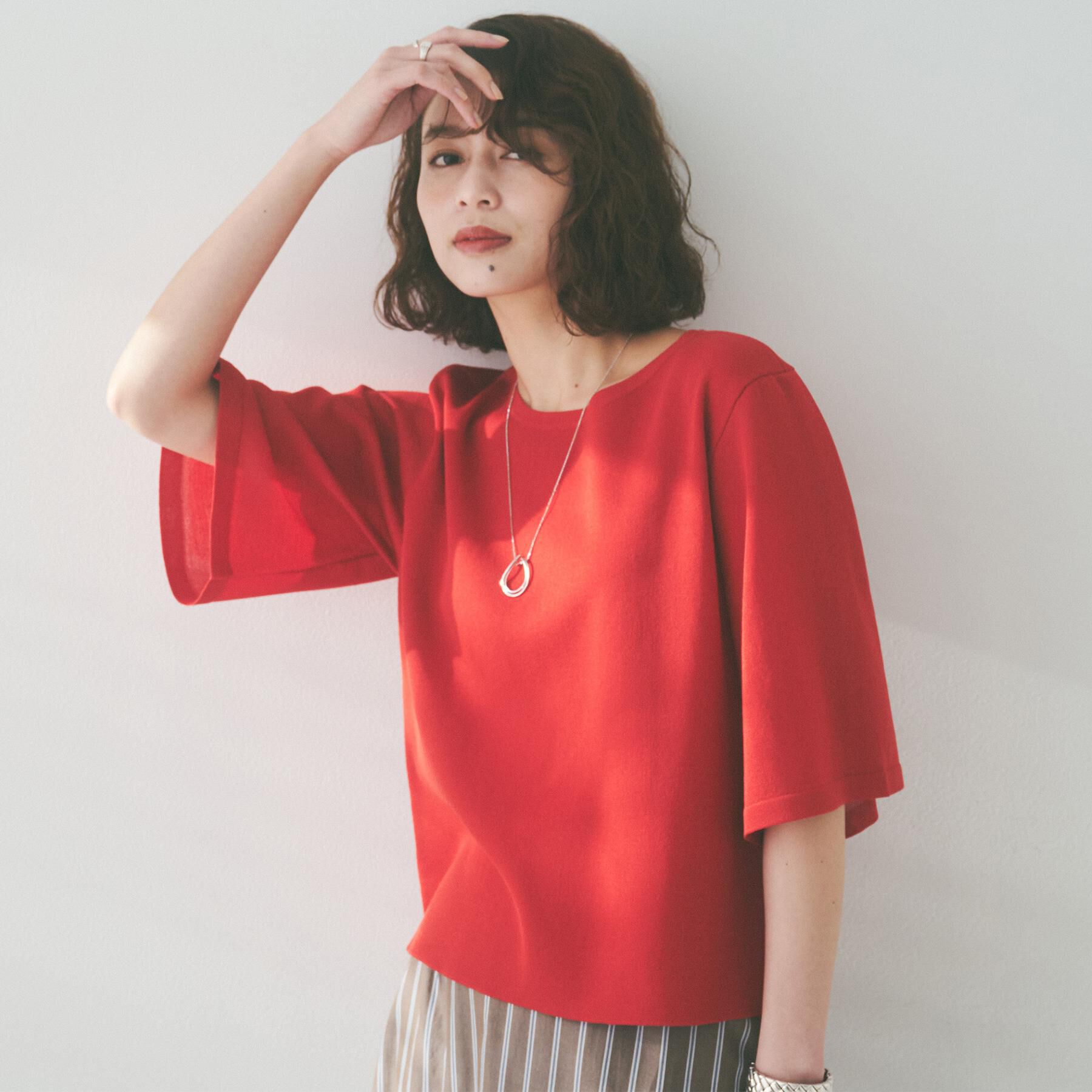 【デザイン】ボディ部分は透け感がなく、袖部分が品の良いシアー感、分量感を抑えた軽いフレアスリーブで、清涼感とドライタッチな質感のプルオーバー。程よい.. |