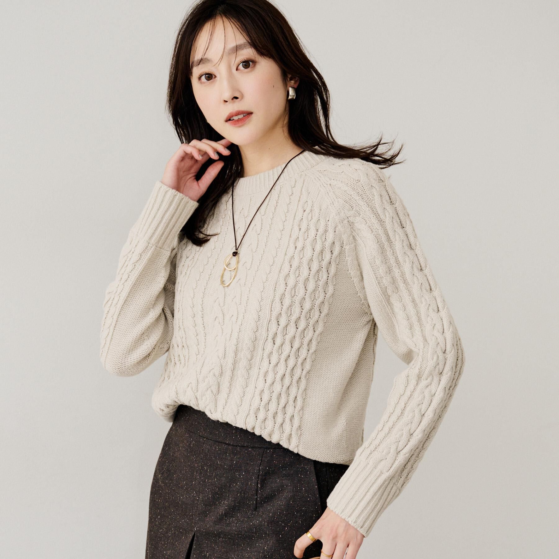 【デザイン】暖かくふくらみのあるスポンディッシュで軽い素材、一枚で着てもコートインでも着やすい肉感のケーブル柄プルオーバーニット。肩のラインに丸みが.. |