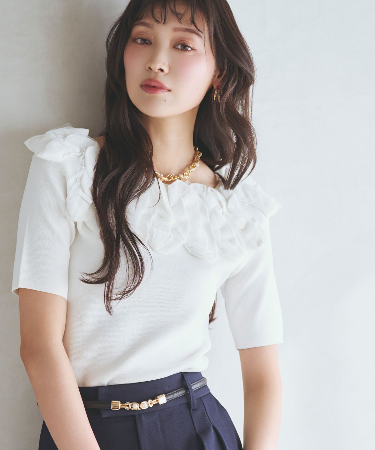 顔まわりを華やかに彩る、フリルボートネックニットプルオーバー【Design/Styling】・デコルテラインにたっぷりとあしらったフリルが印象的な、フェミニンムー.. |