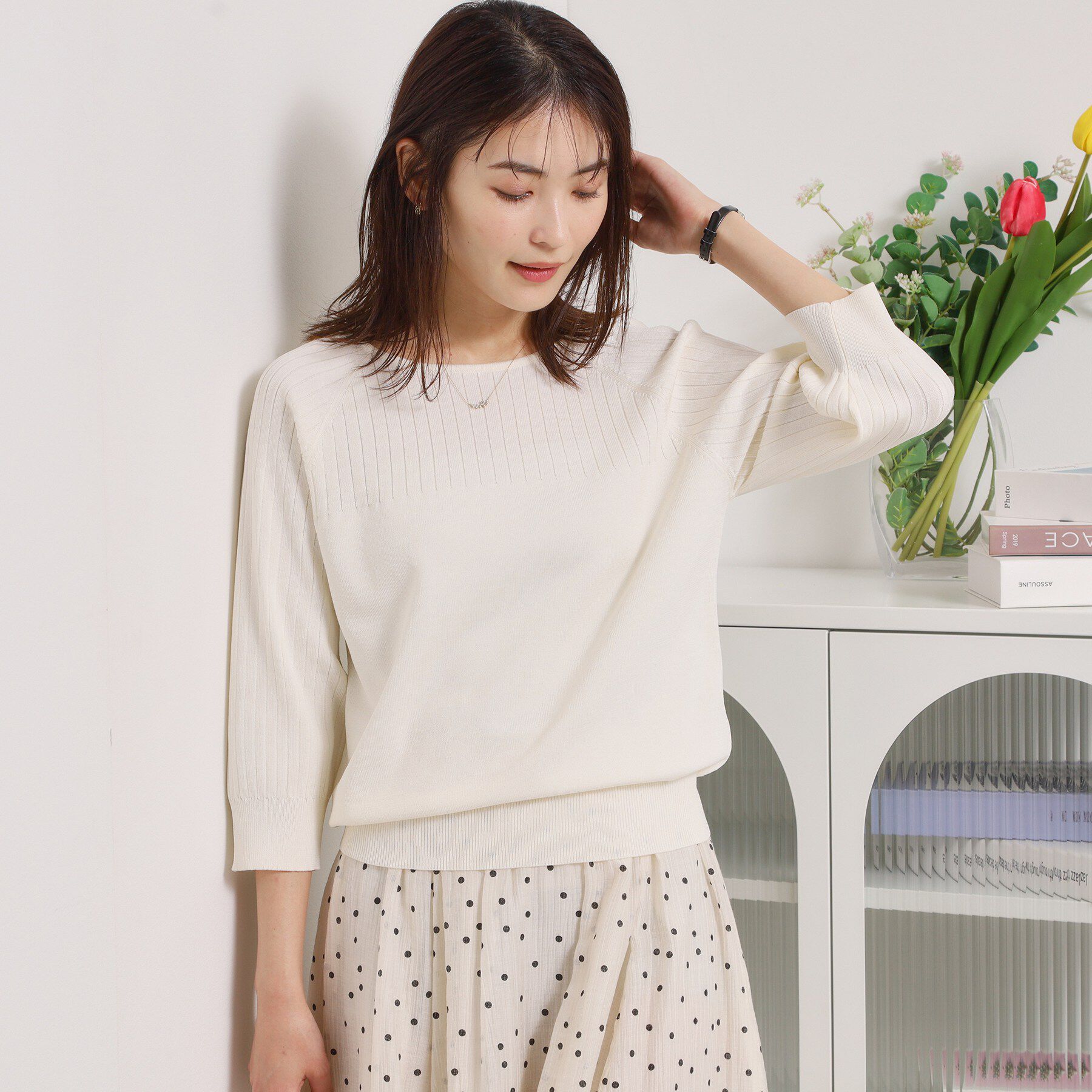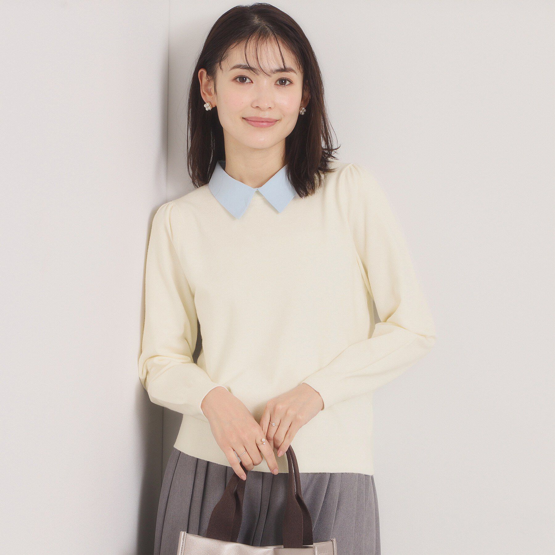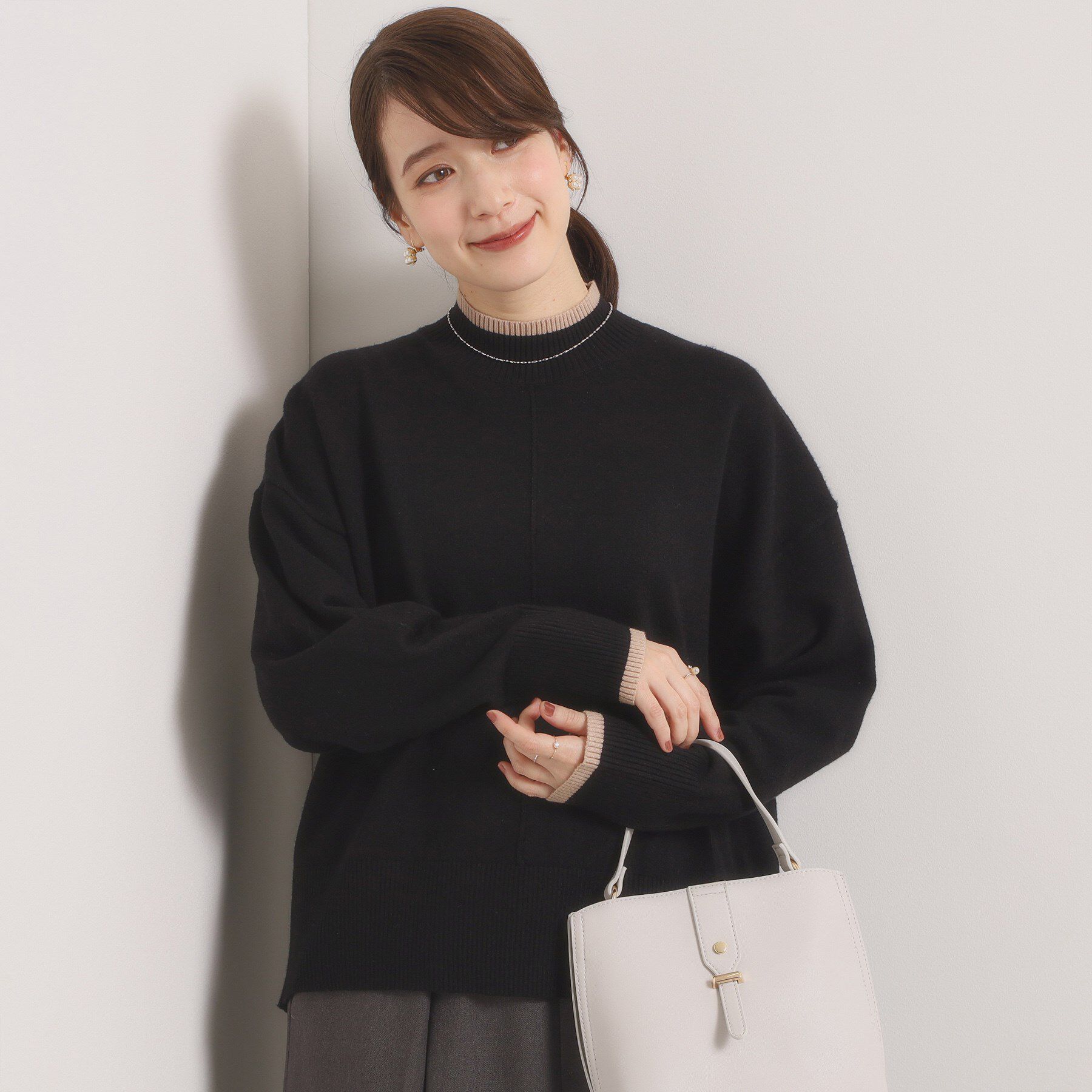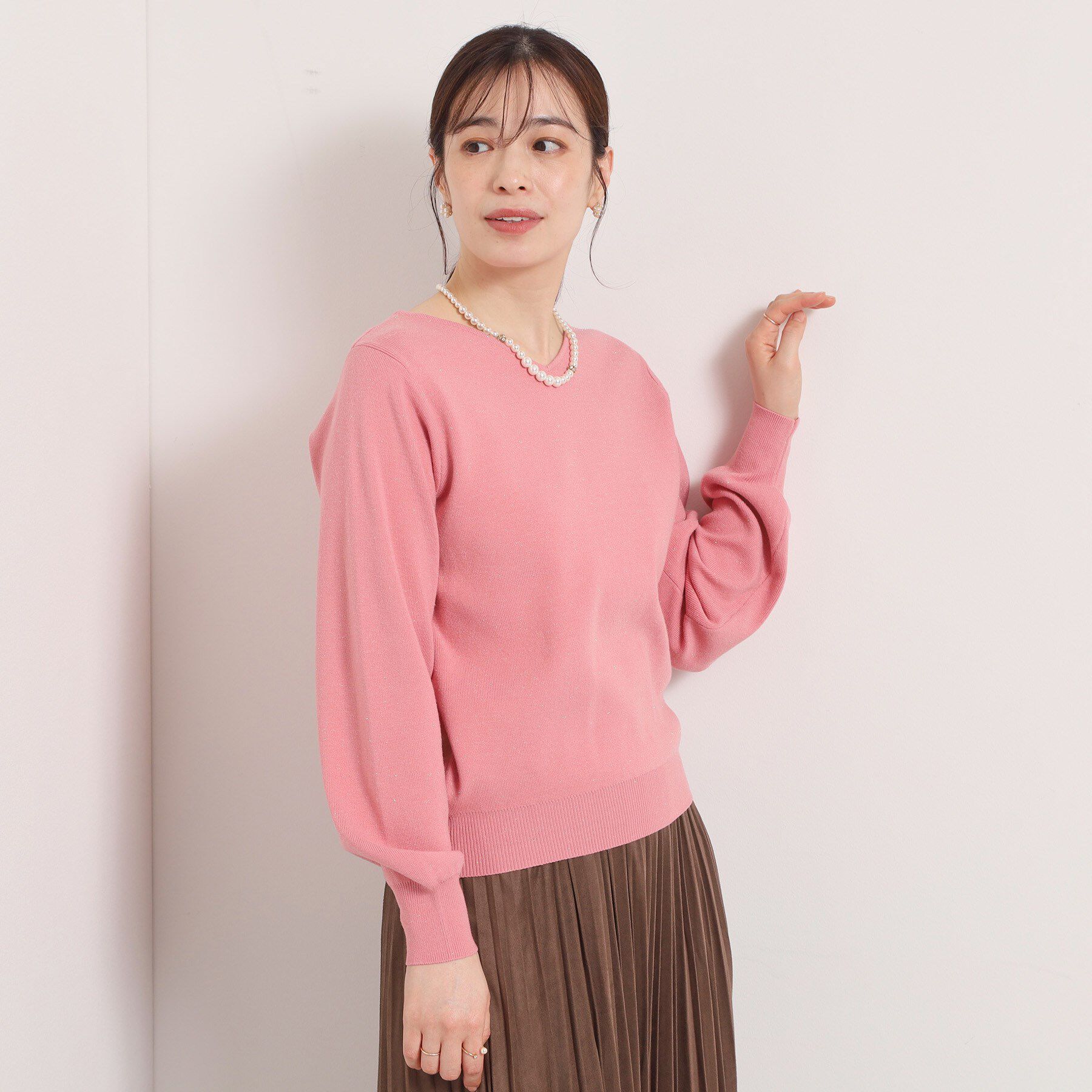 【デザイン】嬉しい機能付きでこの春大活躍のニット。袖口のパール調ディテールがさり気ないアクセント。1、毛玉になりにくいアンチピリング機能2、ご家庭でお.. |