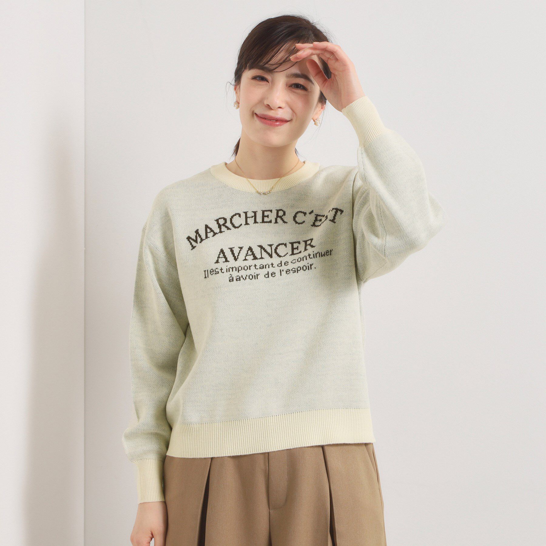 【デザイン】可愛らしさのあるアーチロゴがポイント。ダブルジャカード編みでしっかりとした肉感です。フェミニンなスタイルにも合わせやすいロゴニット。華奢.. |