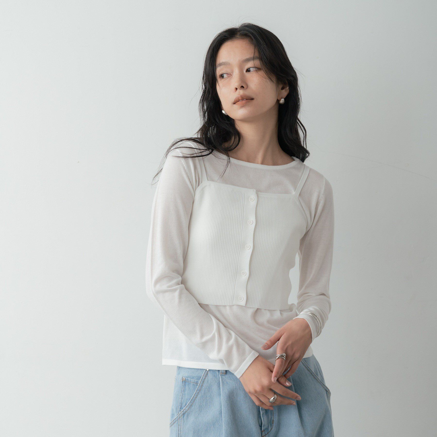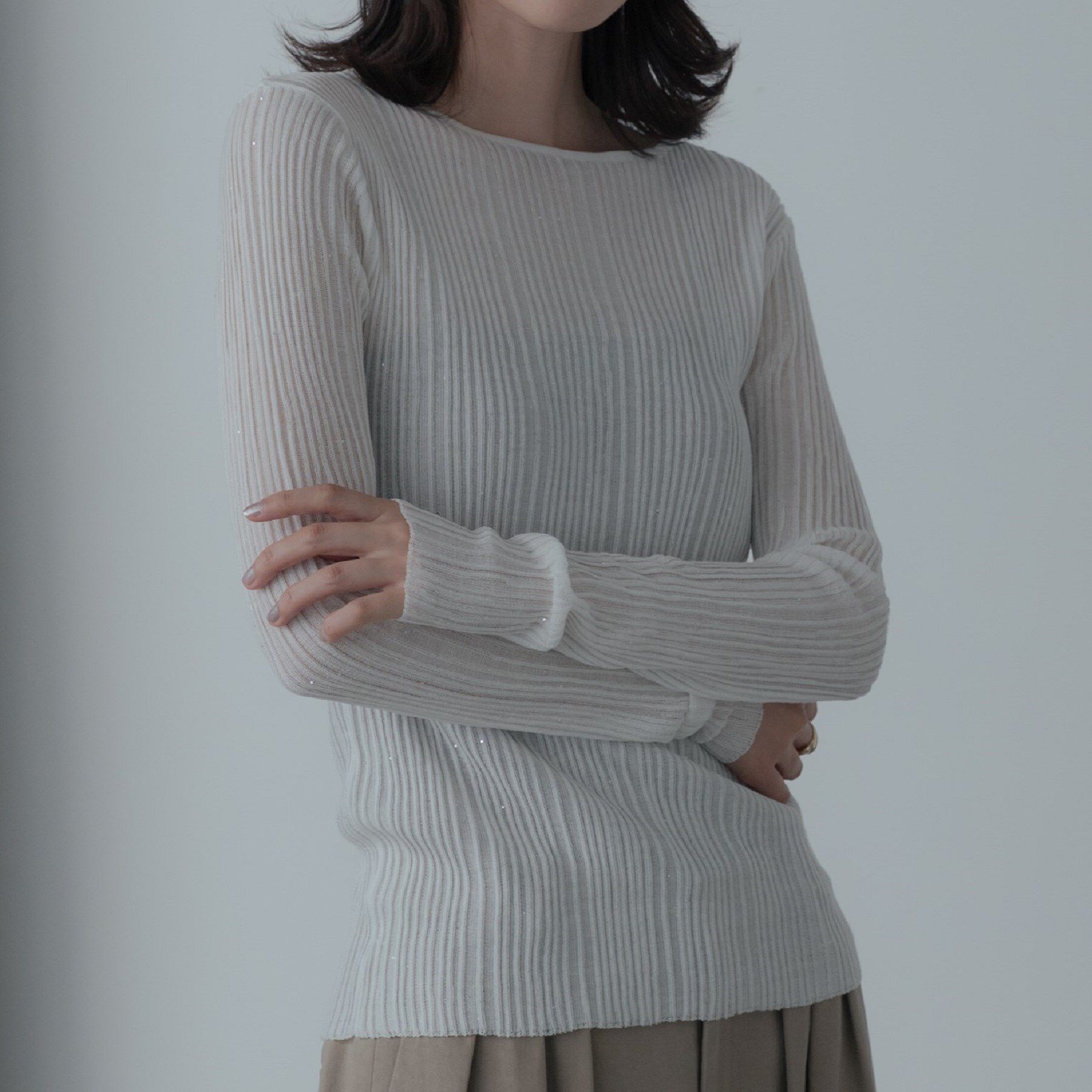 Design Point毎年大人気のシアーリブニット。今年はキラキラ輝くスパンコール糸で仕上げ、スタイリグが華やかになるアイテムにアップデートしました。Styling .. |