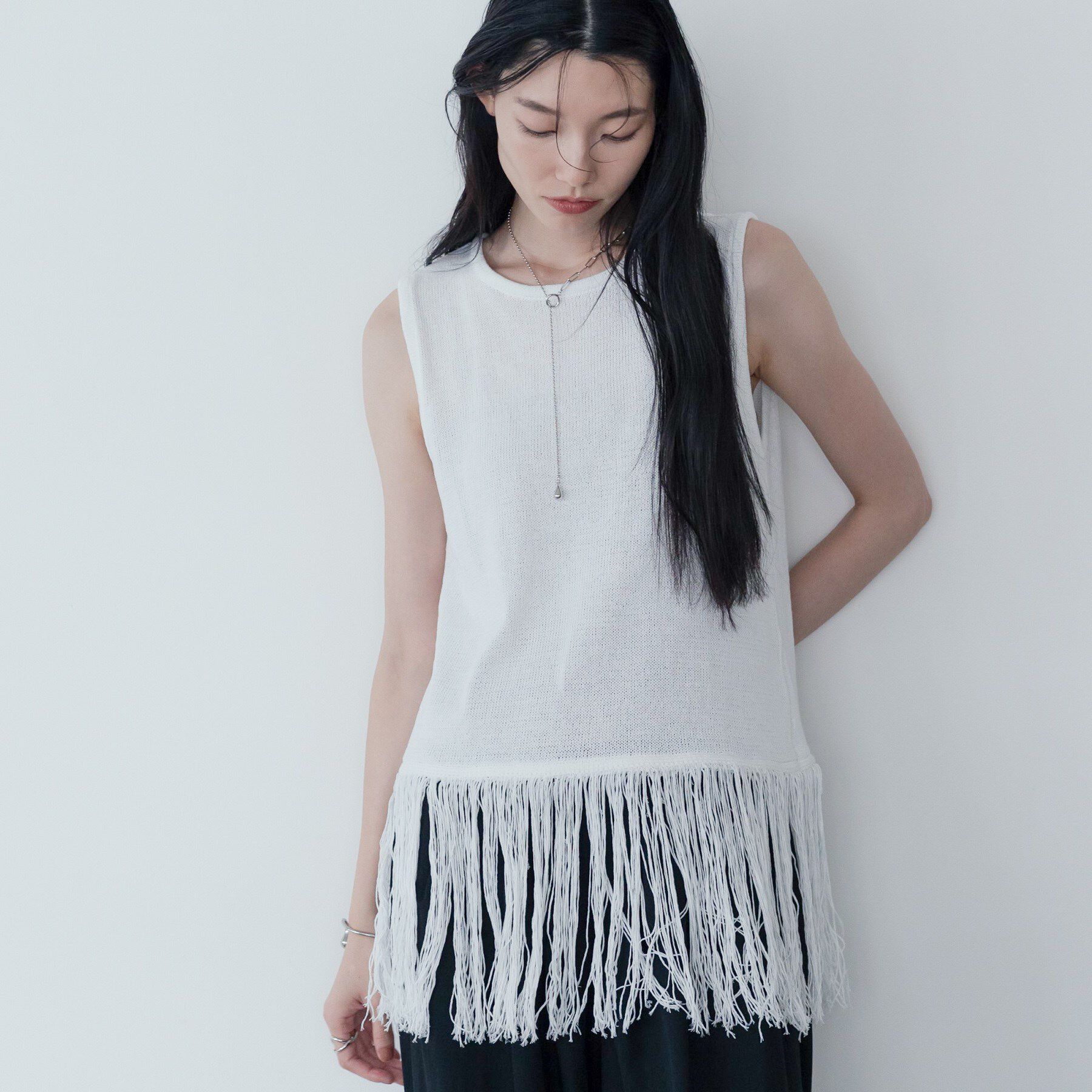 Design Point裾に施されたフリンジが、シンプルながらも存在感を放つ天竺ニット。スリーブレスのフォルムは涼しげな印象を与え、夏のコーディネートに最適。フ.. |