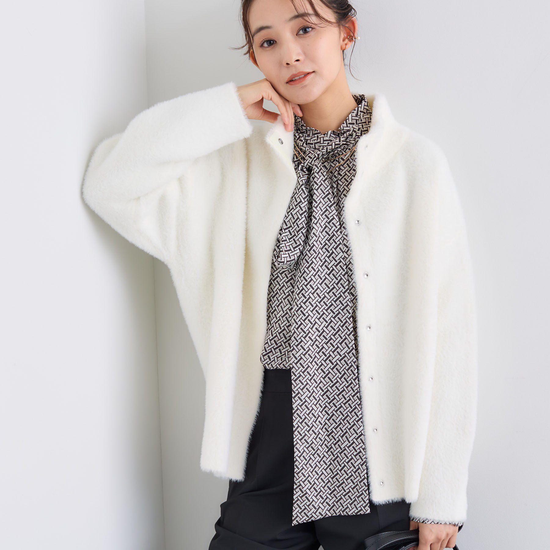 【デザインポイント】トレンドのシャギーニットで触り心地が気持ちよく、スタンドネックで首元まで暖かいアイテム。 シルエットはソフトコクーンでさりげなく.. |