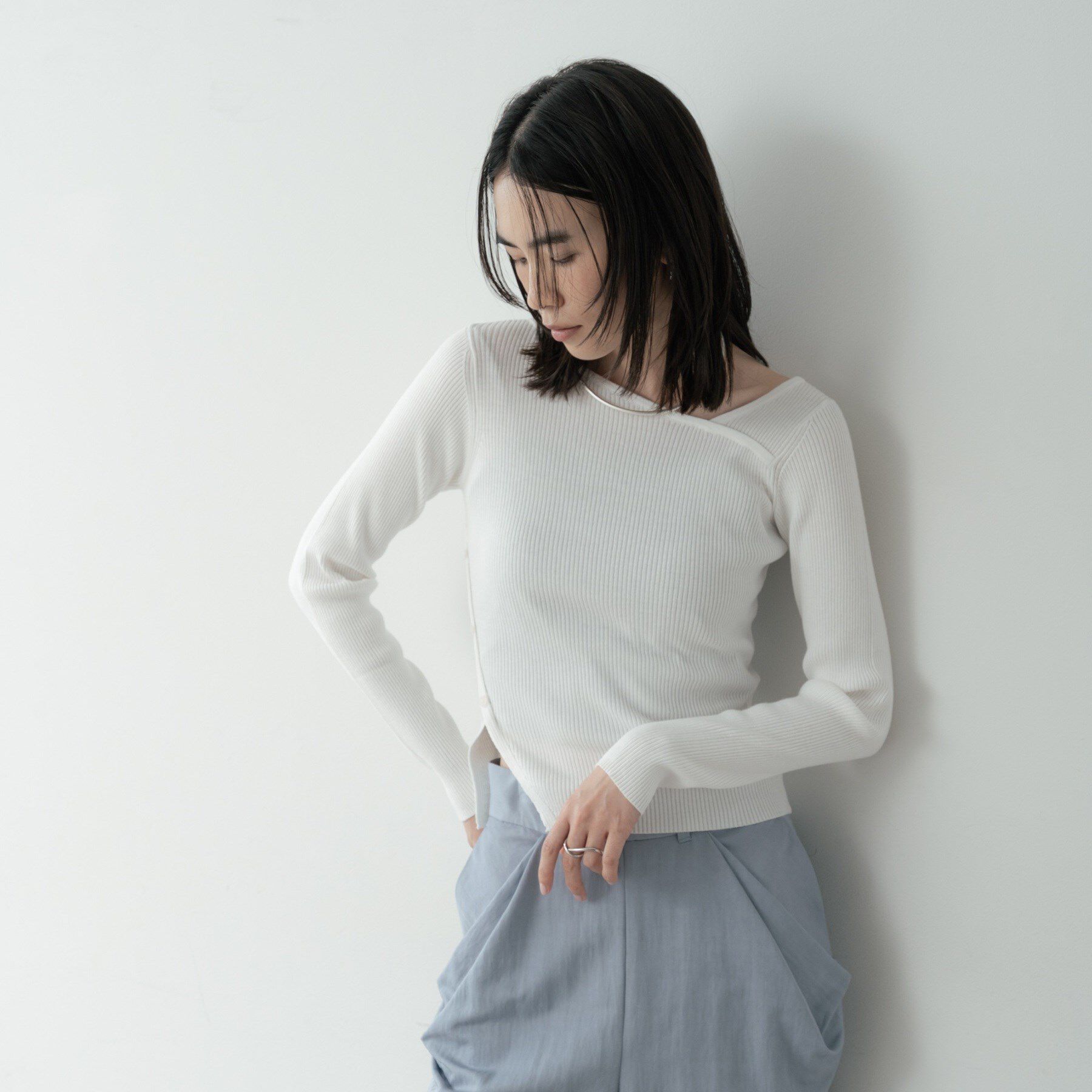Design Pointシアー素材のフレアスリーブが特徴的なデザインニット。洗練されたタイトシルエットと遊び心のあるネックディテールがモードな一枚です。Styling .. |