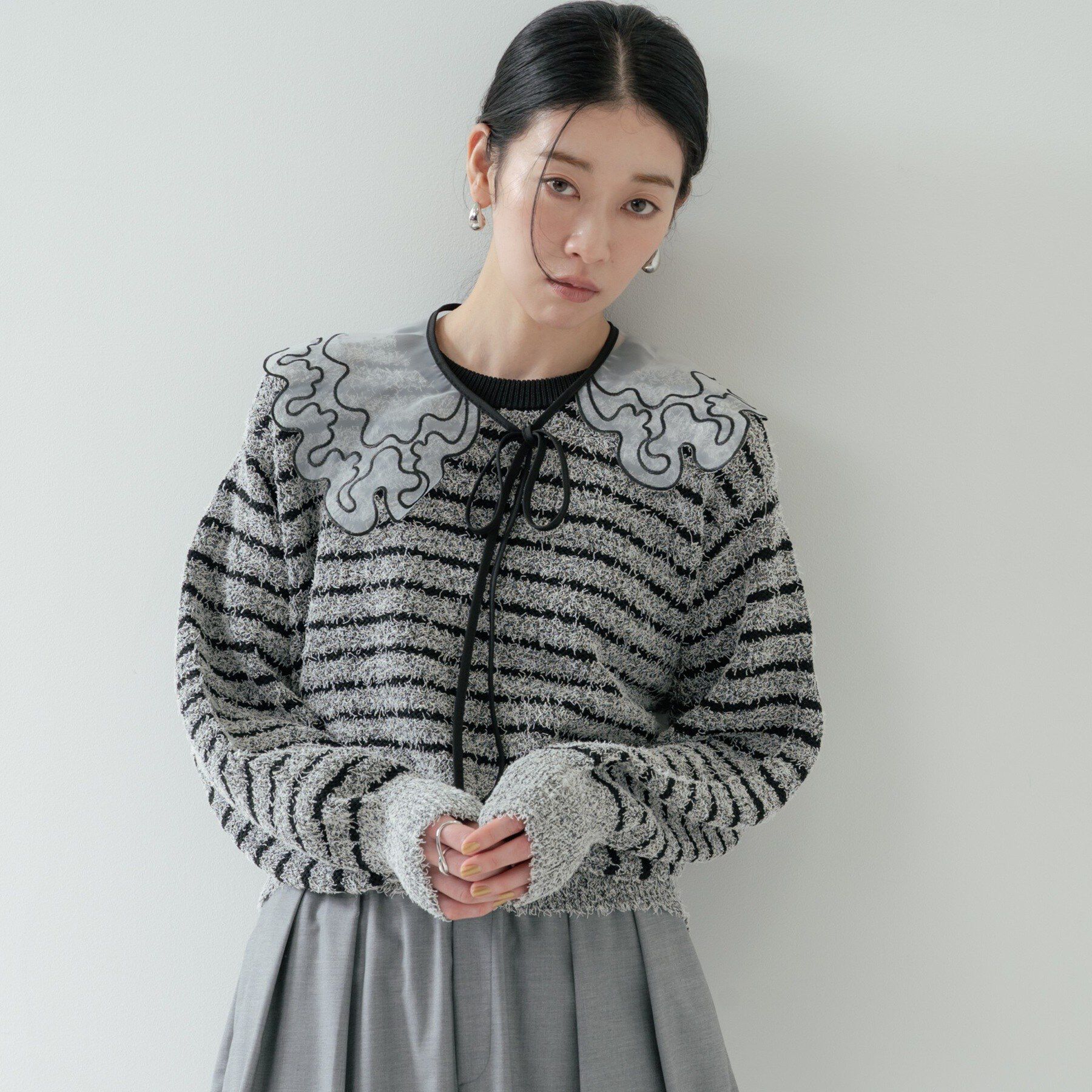 Design Pointシャギー素材を組み合わせたバイカラーボーダーニットは、配色ネックを効かせたモードな一枚。クロップド丈×ドロップショルダーで抜けを作り、幅.. |