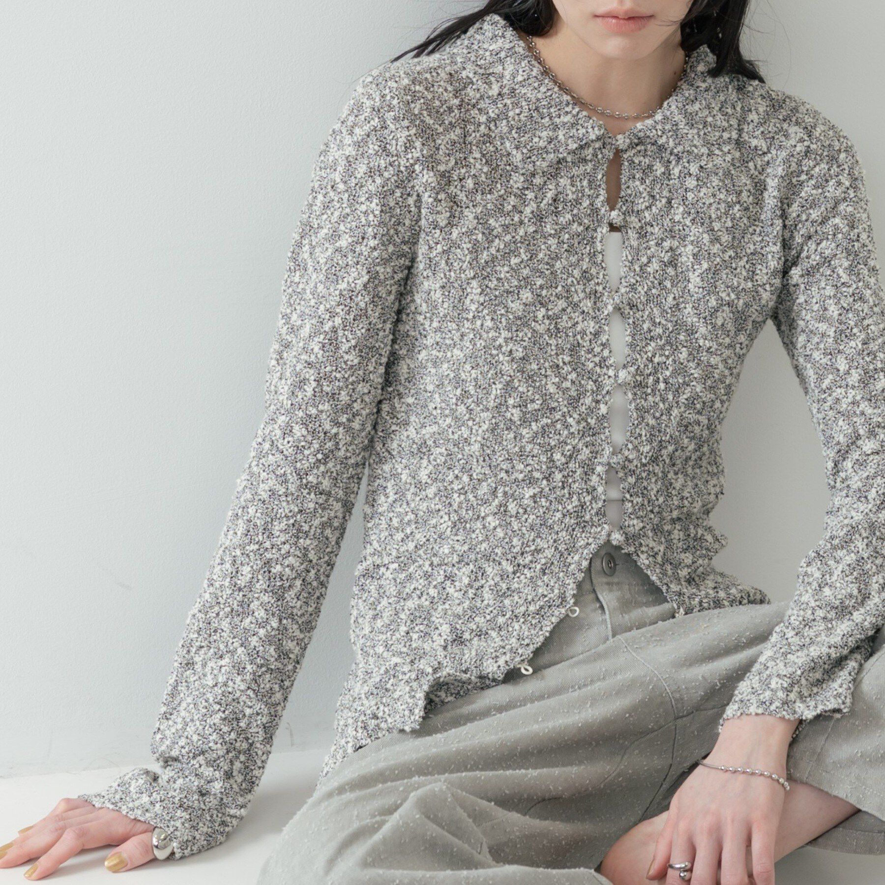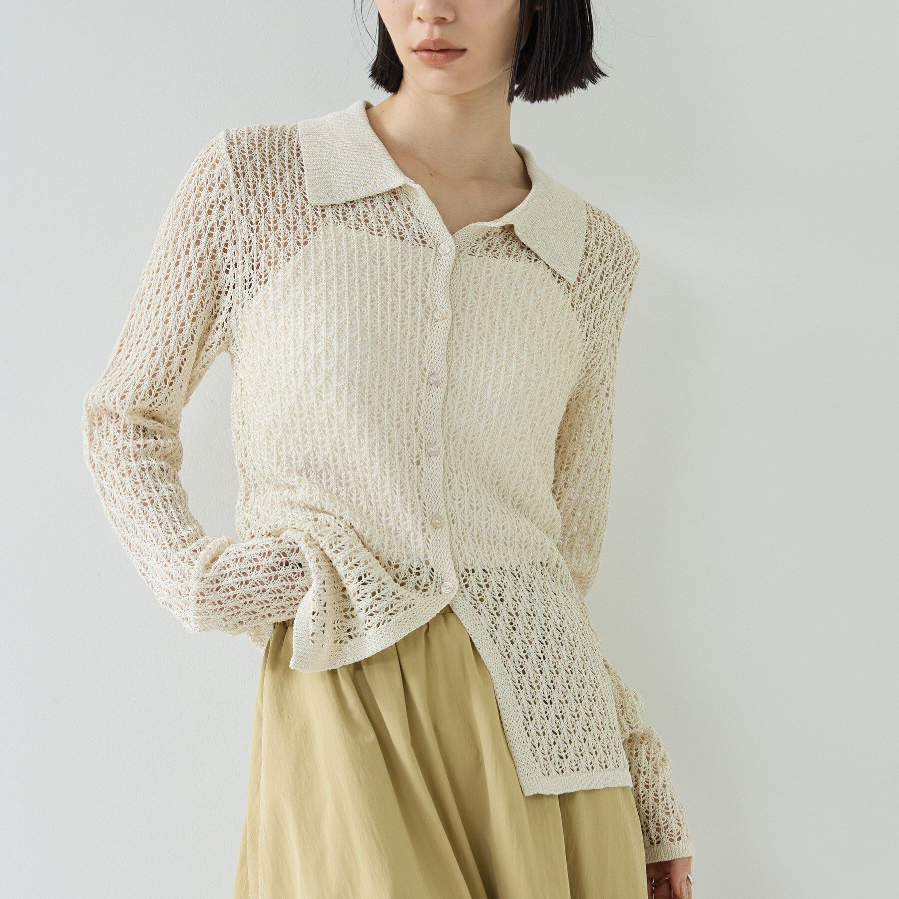 Design Point襟の存在感と繊細な透かし編みが目を引く一着。ボタンを閉めればウエストに沿うコンパクトなフォルム、開ければ抜け感のある表情に変化。袖は細身.. |