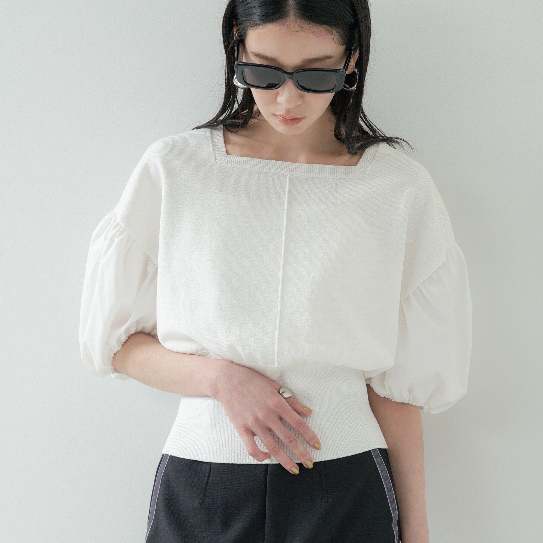 Design Pointデコルテを美しく見せるスクエアネックが洗練された印象のニットプルオーバー。ボリューム感のある素材違いのバルーンスリーブは、腕周りを華奢に.. |