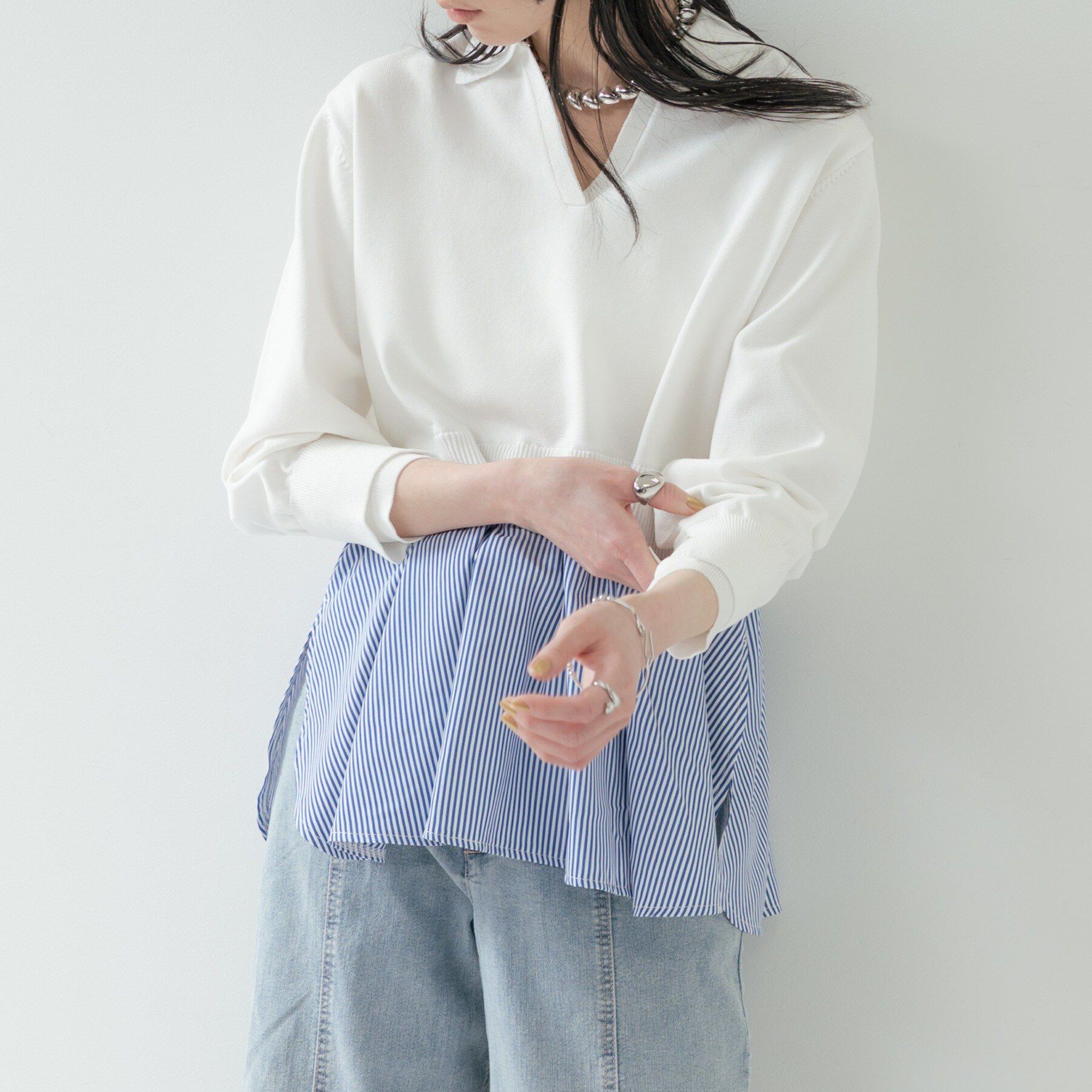 Design Pointポロ衿とVネックのバランスがモードな印象のスキッパーレイヤードニット。短めの着丈のニットの下からストライプ柄の布帛が覗き、まるで重ね着を.. |