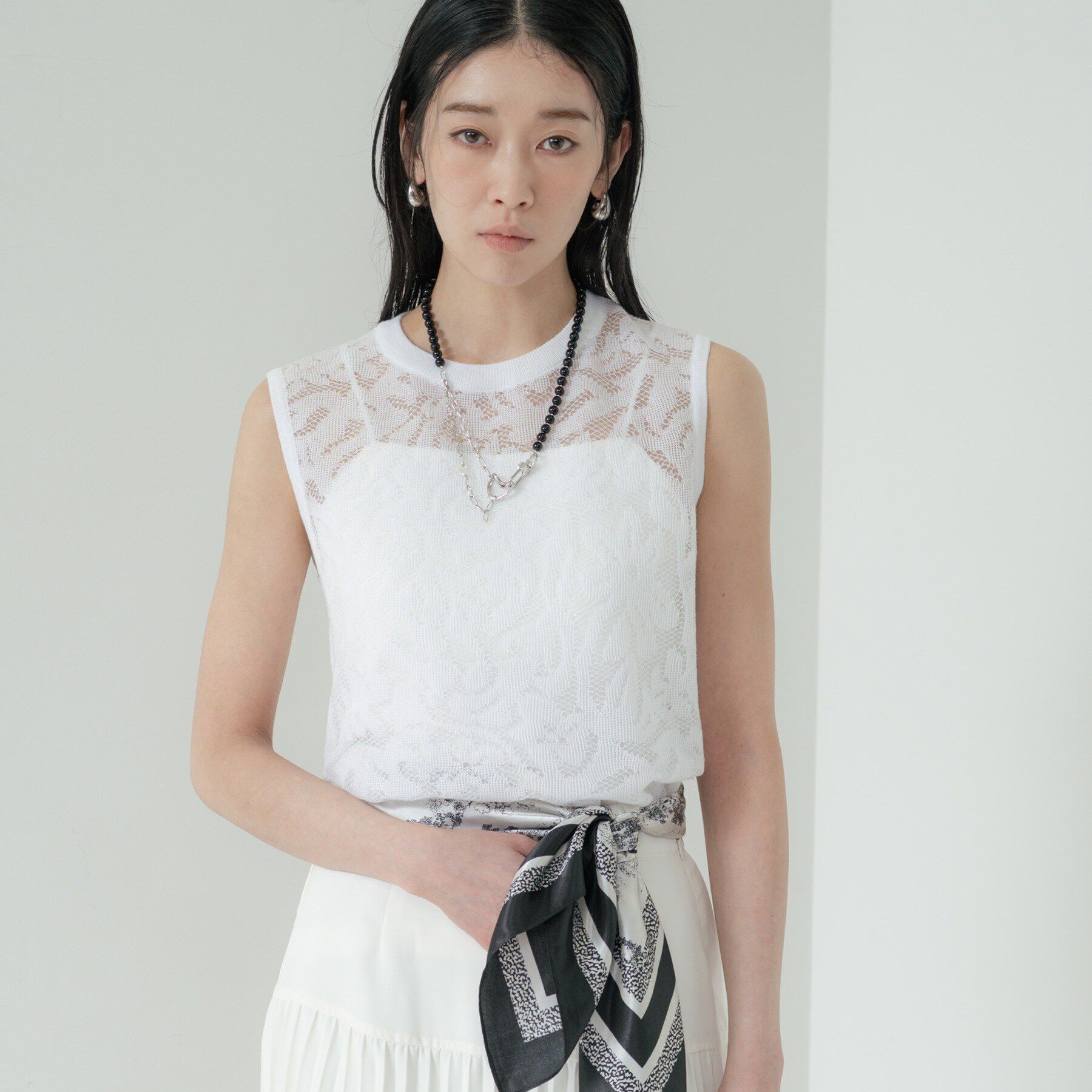 Design Point繊細なレースニットは、シンプルなシルエットながらも存在感のあるトレンドアイテム。肩周りをすっきりと見せるノースリーブがスタイリングを際立.. |