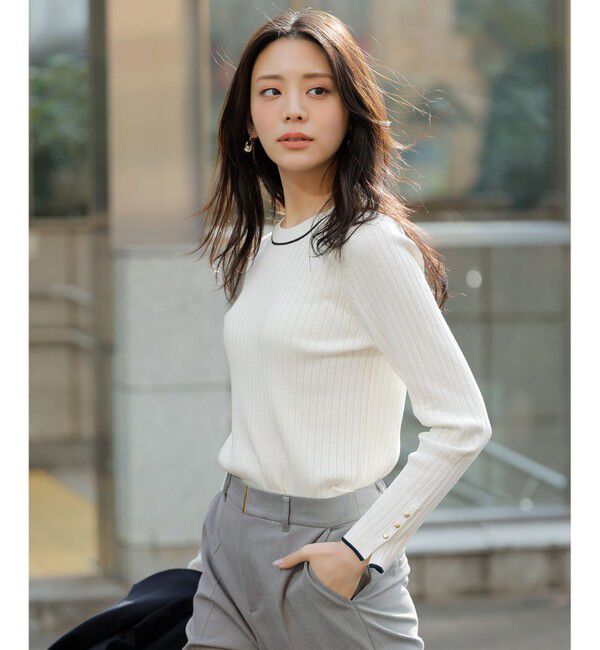 配色ラインを上品に効かせたオフィス映えするきれいめニット■デザイン・きちんと見えするきれいめニットプルオーバー・袖と襟元のラインがポイント・すっきり.. |