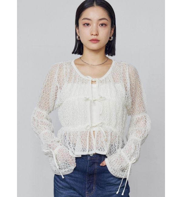 透かし編みの軽やかなニット■デザイン身頃と袖裏にゴムを施し、ギャザーを寄せる事で程よい立体感と女性らしいシルエットがポイントです。前開き部分はリボン.. |