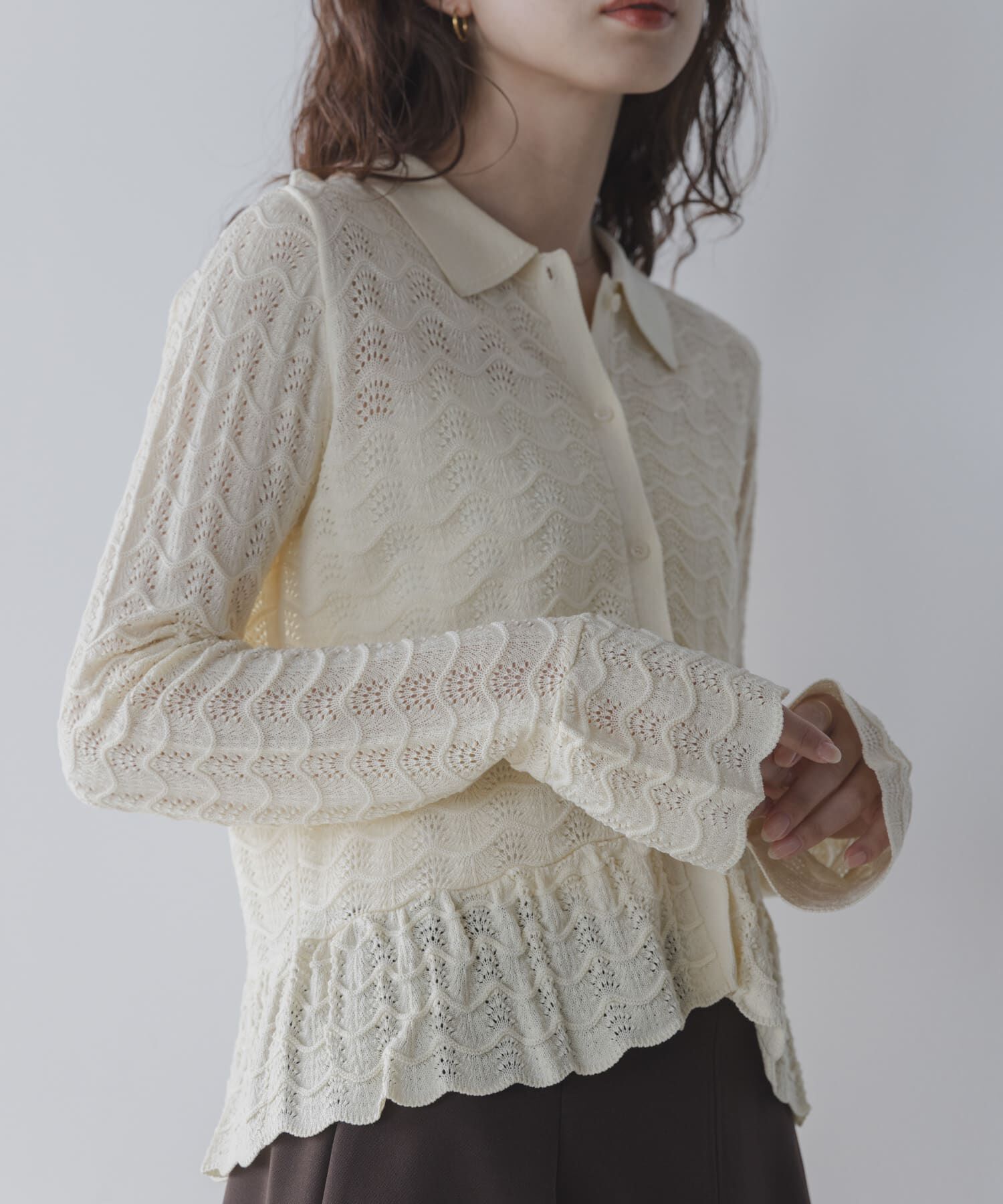 繊細な編み柄が目を惹く主役級トップスレースのように繊細に編まれた模様が目を惹くシャツ型ニット。伸縮性がありほどよく身体にフィットするコンパクトなサイ.. |