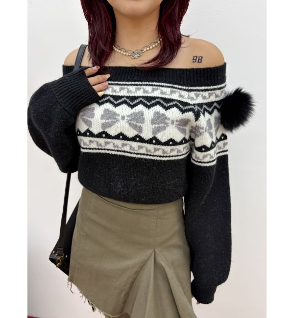 ジャガード柄と肩部分のポンポンがポイントのオフショルニットです。ニット全面のジャガード柄はオリジナルで作成したグラフィックになっており、トレンドモチ.. |