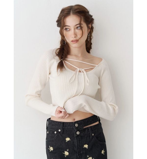 ■デザイン程よくフィットする細リブ素材のニットにデコルテを美しく魅せるカッティングとクロスリボンデザインのクロップドトップスです。 デコルテ部分の肌見.. |