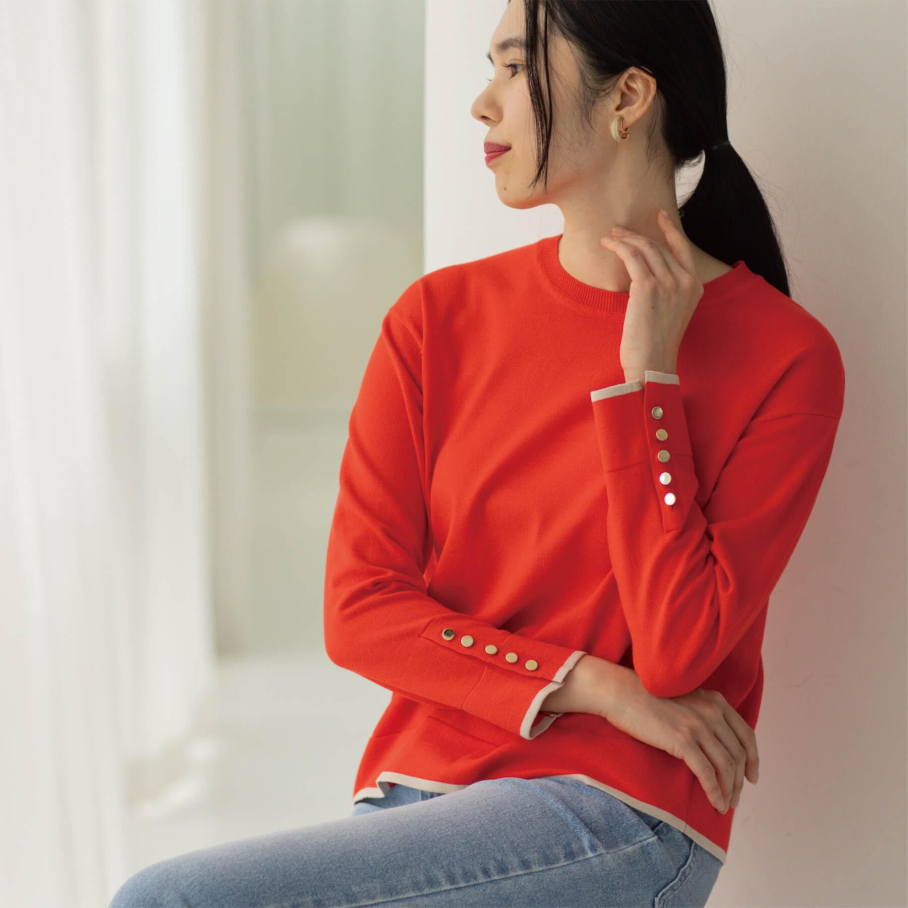 通勤にも、デイリーにも活躍!袖口の金釦とバイカラーがポイントの上品ニット【デザイン】・ややゆとりのあるボクシーなシルエットで、さらりと着られるシンプ.. |