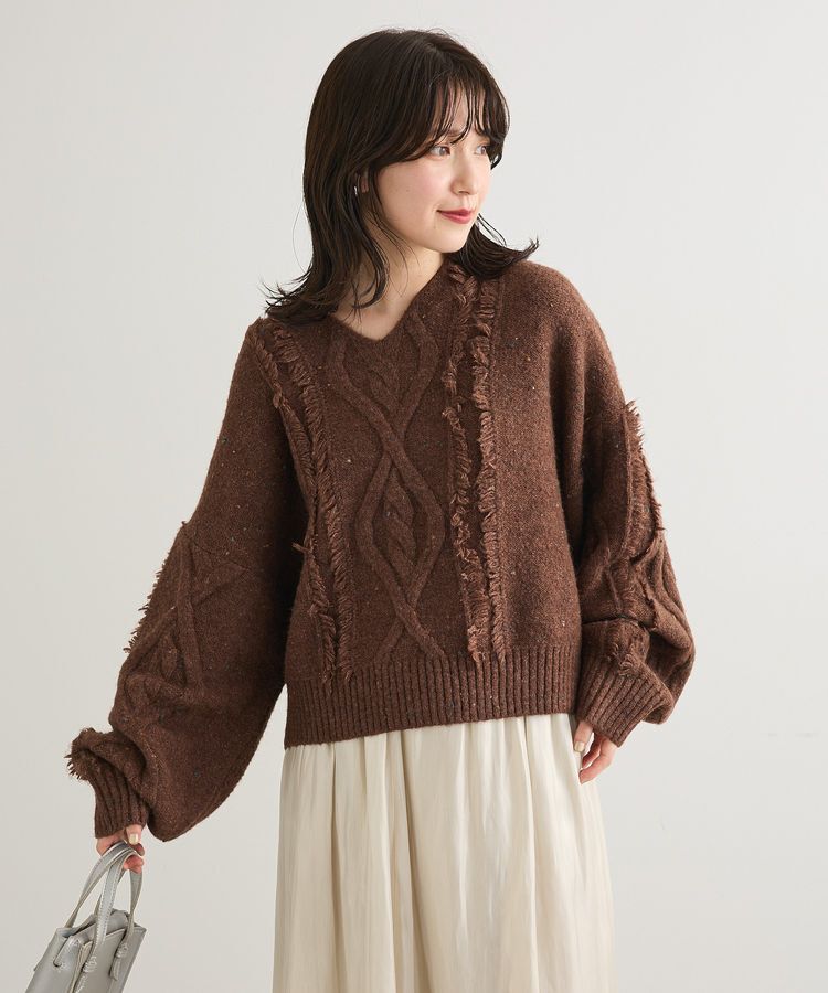 カラフルな糸を編み込んだ表情豊かなニット素材で編み立てたプルオーバー。凹凸感のあるケーブル編みやフロントと肩のフリンジディテールが洗練されたアクセン.. |