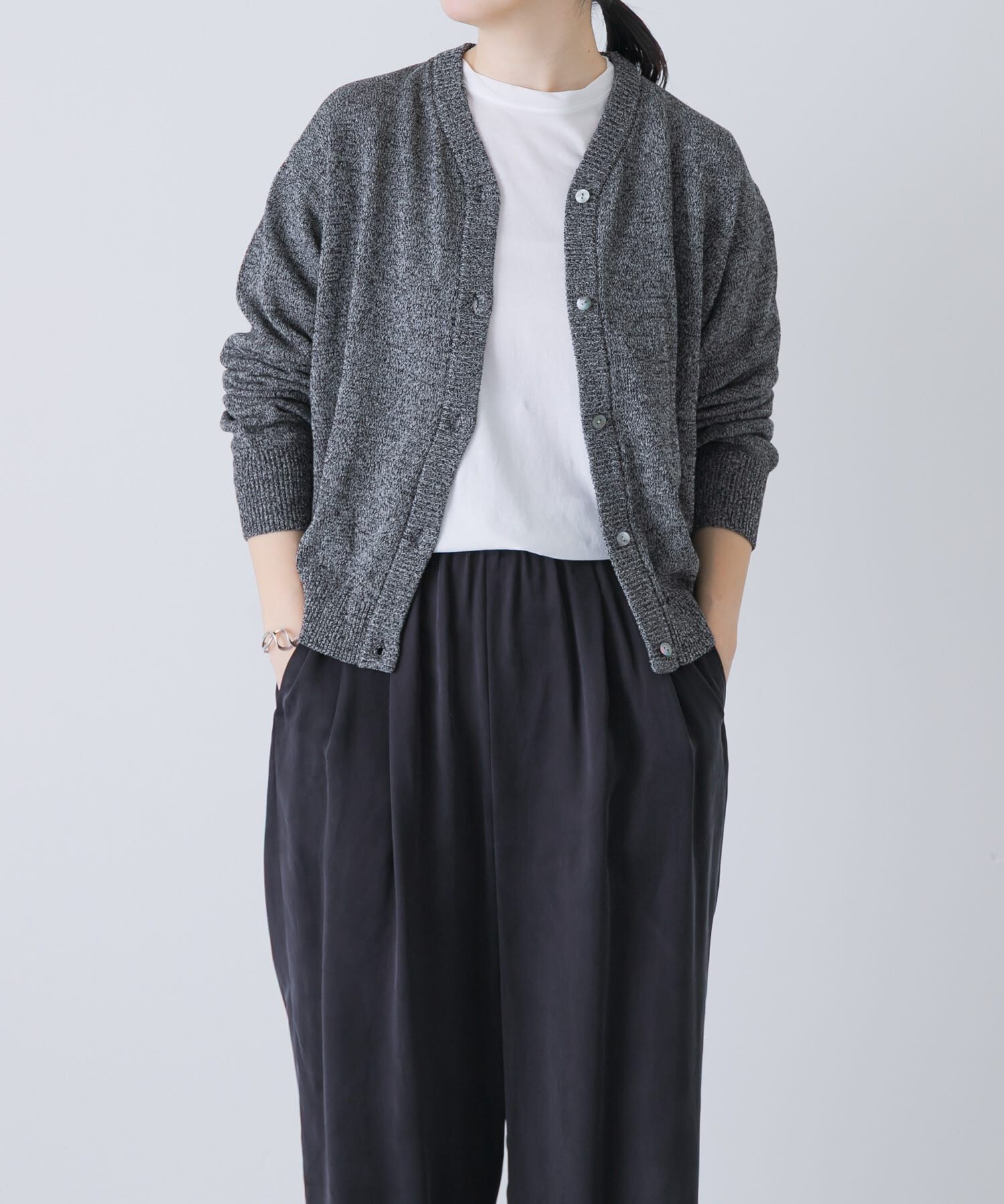 トップスにも羽織にも。シーンを問わず活躍毛玉ができにくいコットン100%のニットでカーディガンをご用意しました。ハイツイストの糸を使用し、さらっとしたド.. |