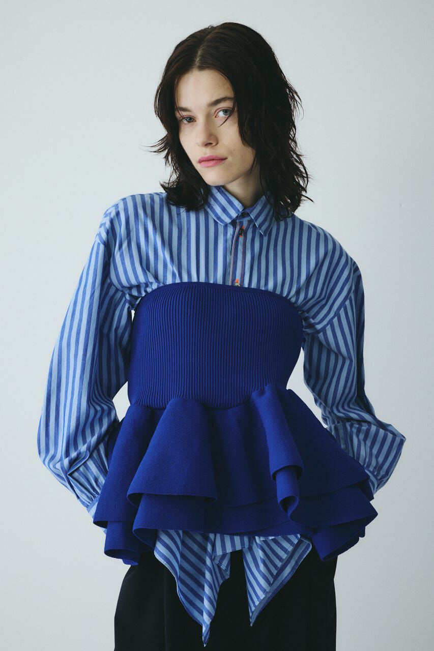 裾のフリルが目を引くビスチェ1枚で存在感があり、アクセサリー感覚で着用していただける一枚。ニットなのでしっかりと伸縮性もあるのが嬉しいポイントです。.. |