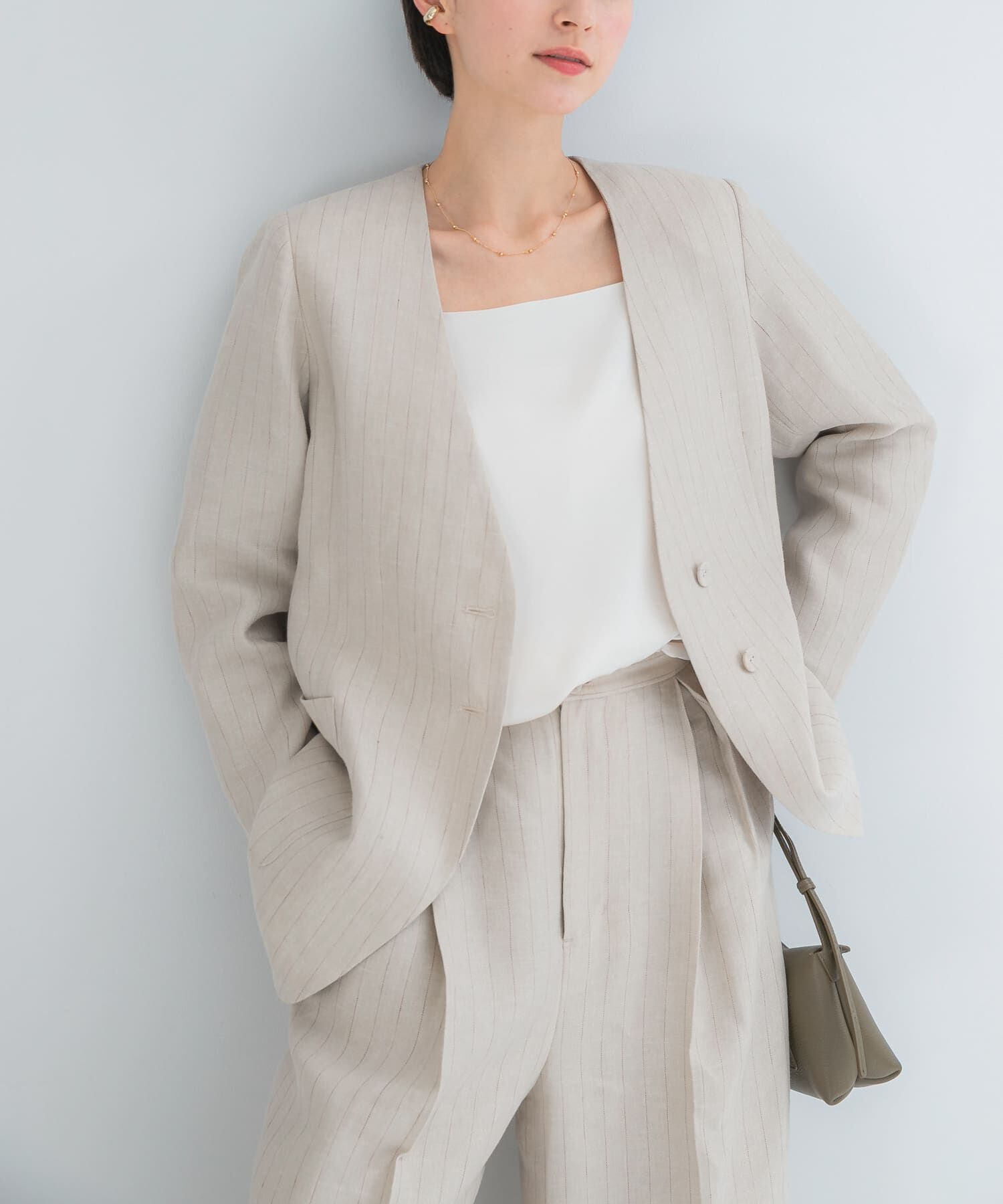 【アーバンリサーチ/URBAN RESEARCH】 ラメリネンストライプノーカラージャケット