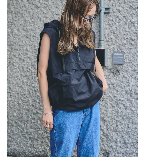 ●お届け予定:3月上旬●限定数量に達し次第、締め切りとなります"ナイロンタンブラーワッシャー生地のアノラックベスト。ハーフZIPファスナーとフード.. |