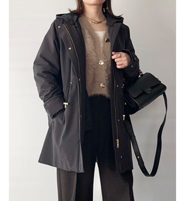 [アイテム説明]メルトン加工を施した起毛素材のミドル丈フード付きコートです。ヒップをカバーするミドル丈であたたかさも◎フロントは比翼仕立てにすることで.. |