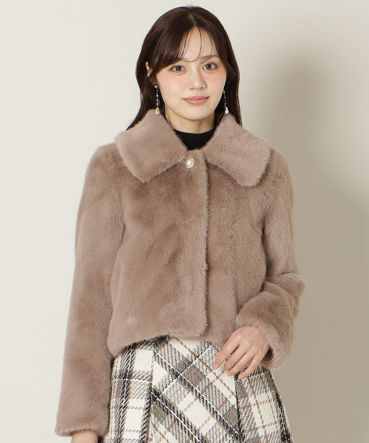 ふわふわフェイクファーのショート丈ブルゾン【Design】・ステンカラーとパールボタンが上品見えさせてくれるフェミニンショートコート。・毛足の長いふわふわ.. |