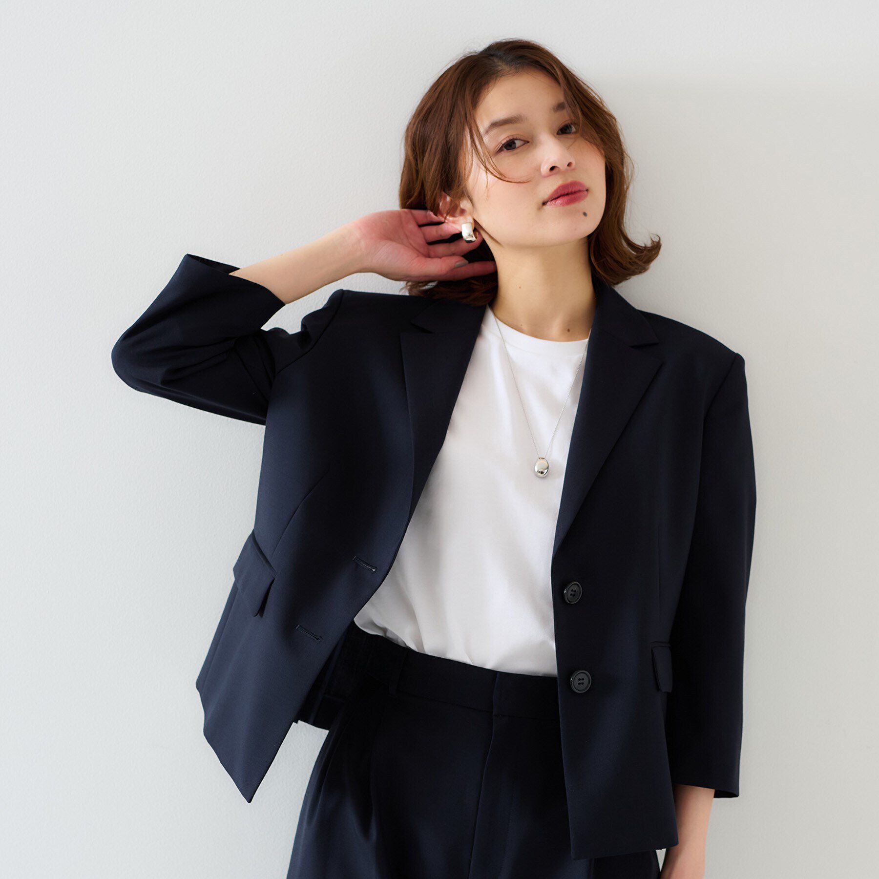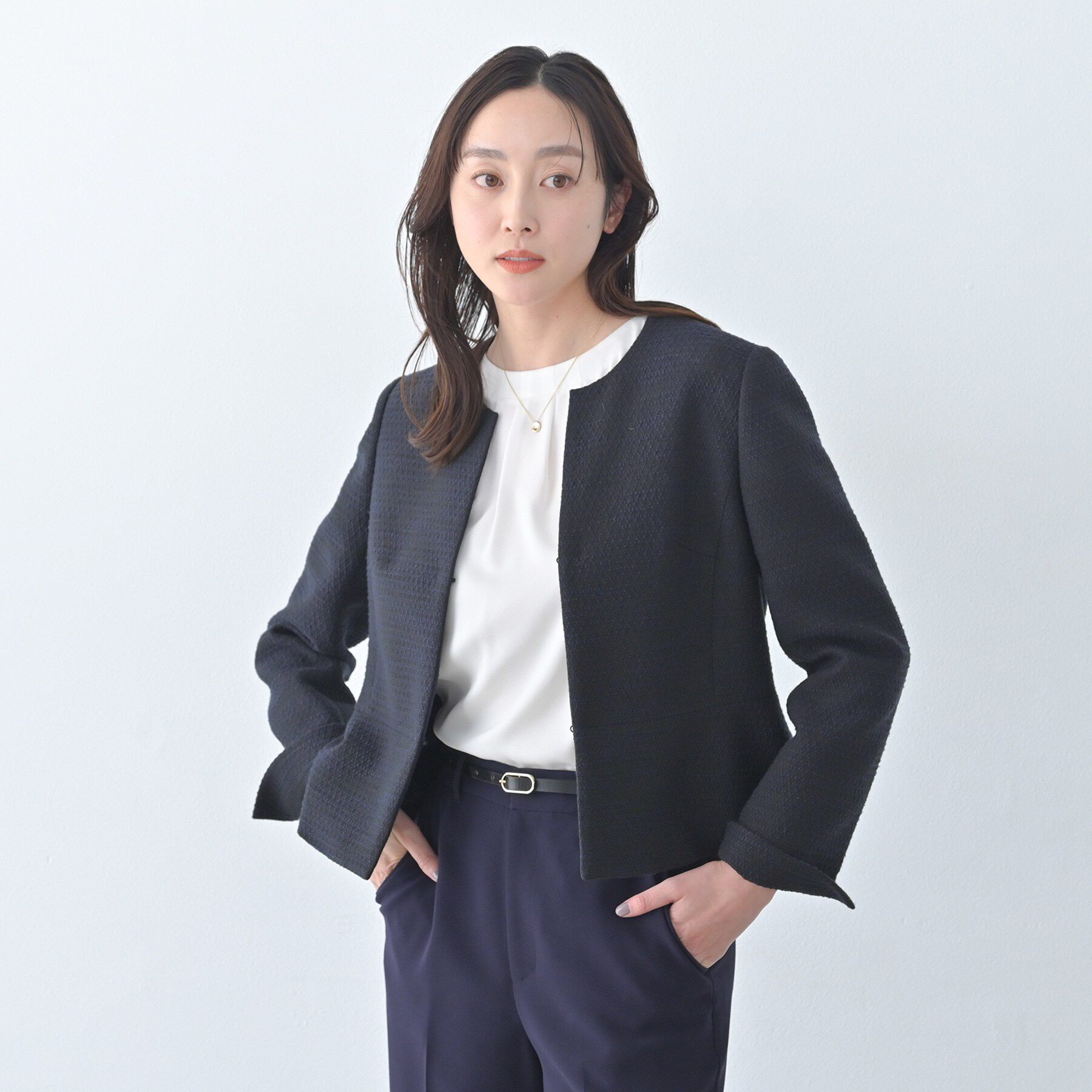 【デザイン】プレッピーな紺ブレスタイルを再解釈したシングルブレストジャケット。さらりとした風合いのトロピカルウールの醸し出すメンズライクな雰囲気が魅.. |