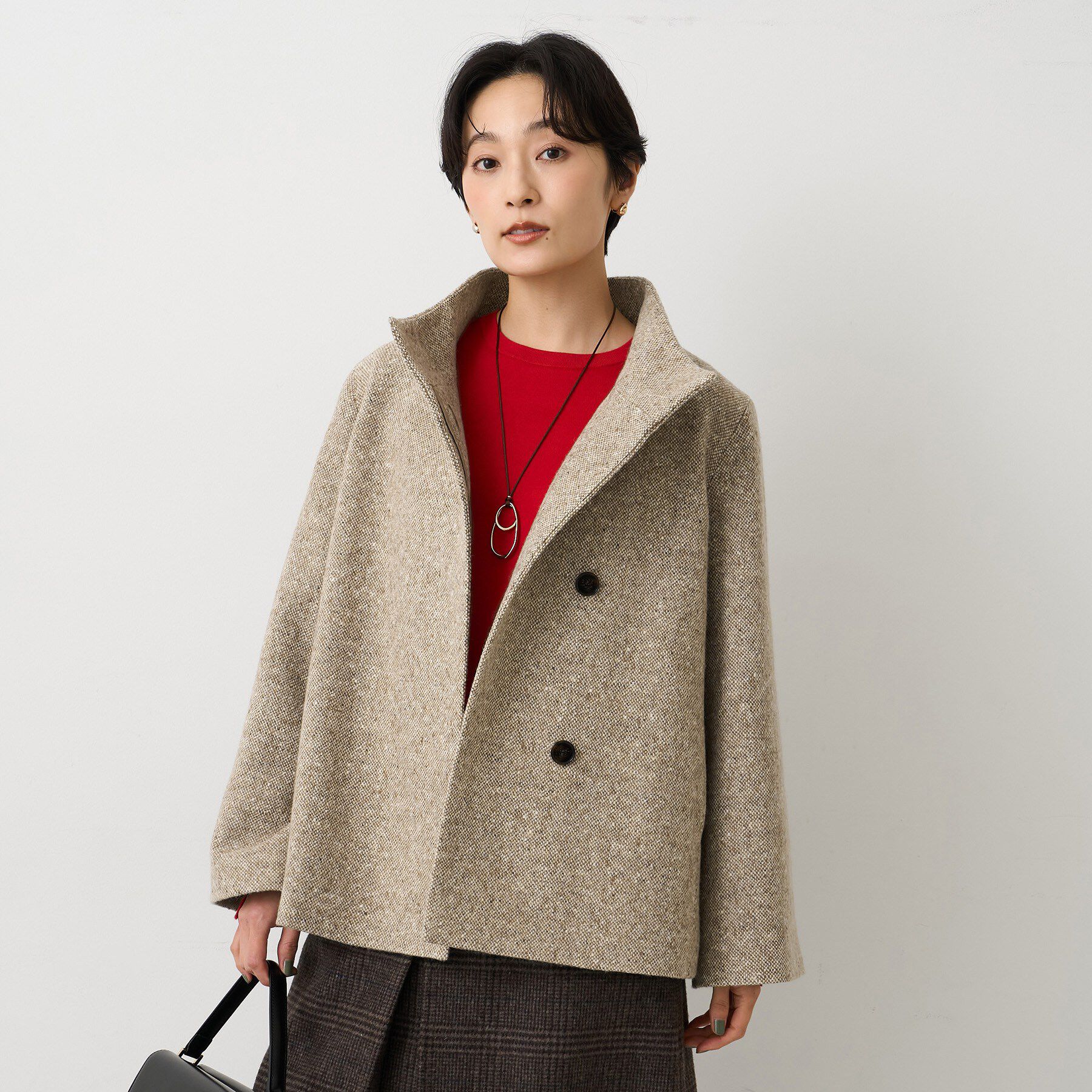 【デザイン】ネップツイード素材のスタンドカラーコート。クラシックなデザインがエレガントさを引き立てながら、どんなシーンにもピッタリなアイテムです。ス.. |
