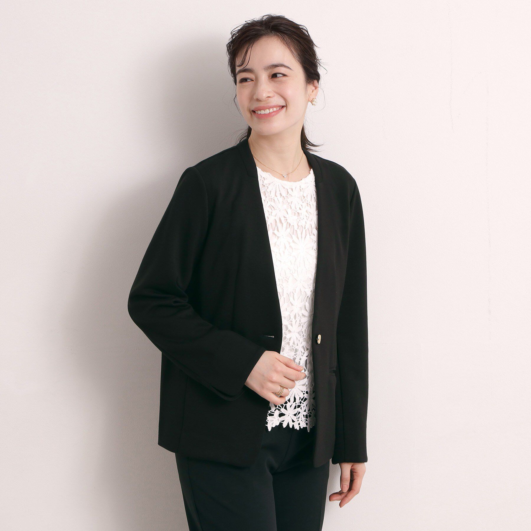 【デザイン】通勤スタイルからセレモニー対応まで幅広く活躍。着心地柔らかなジャージー素材ジャケット。すっきりシャープな印象で着られるノーカラーデザイン.. |