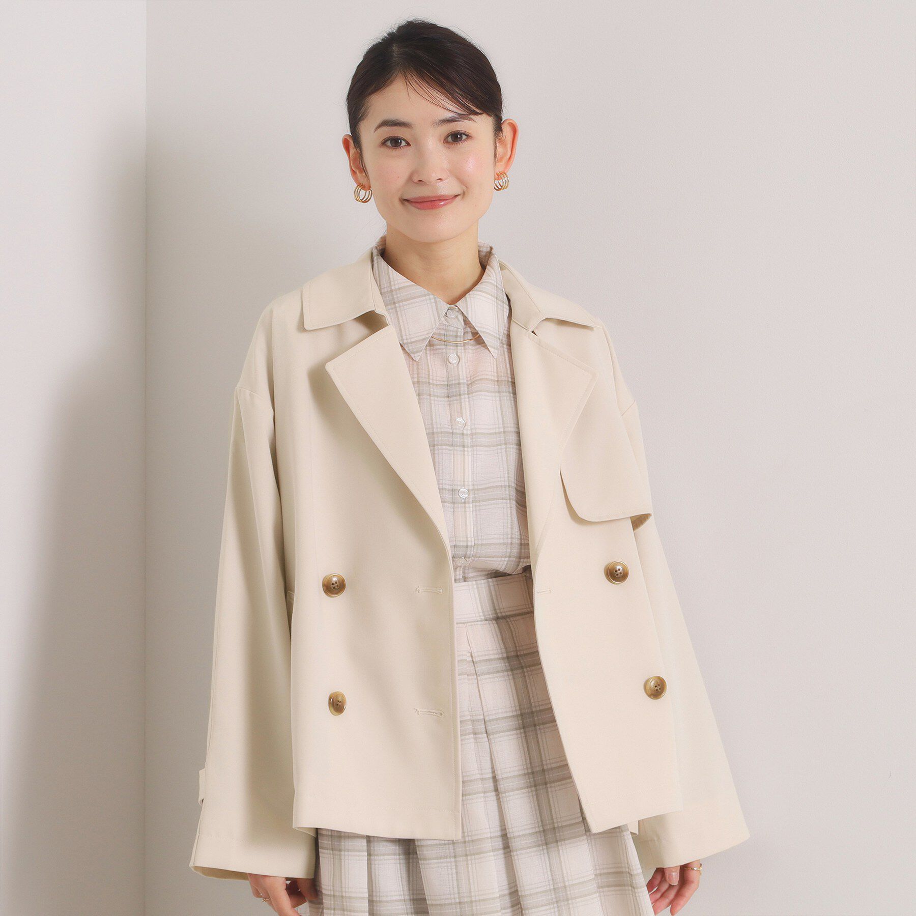 【デザイン】撥水&花粉防止機能素材さらりと羽織れるショートトレンチコートジャケット感覚でさらりと軽く羽織りやすいショートトレンチコート。背中心にタッ.. |
