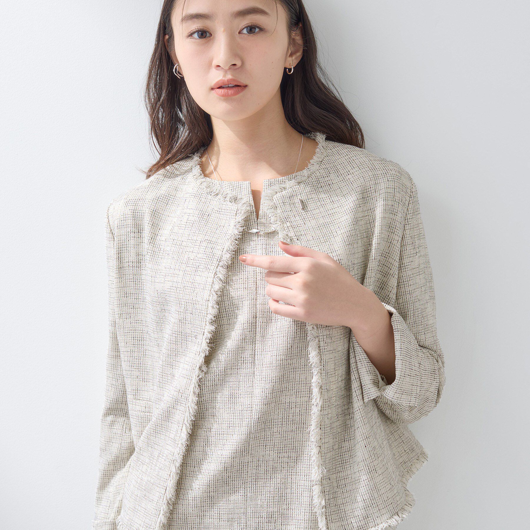 【デザインポイント】軽い素材感のツイードを使用した華やかなノーカラージャケットです。ハレの日でもより気軽にご着用いただきたいという想いから、シルエッ.. |