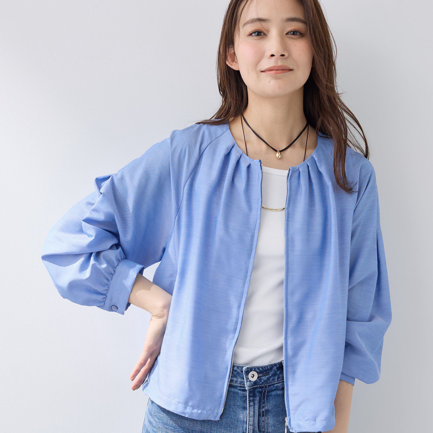 【デザインポイント】ブルゾンとブラウスの要素を融合させた軽やかなアウターです。襟元の繊細なタックデザインが女性らしい柔らかな印象を与えます。裾はドロ.. |