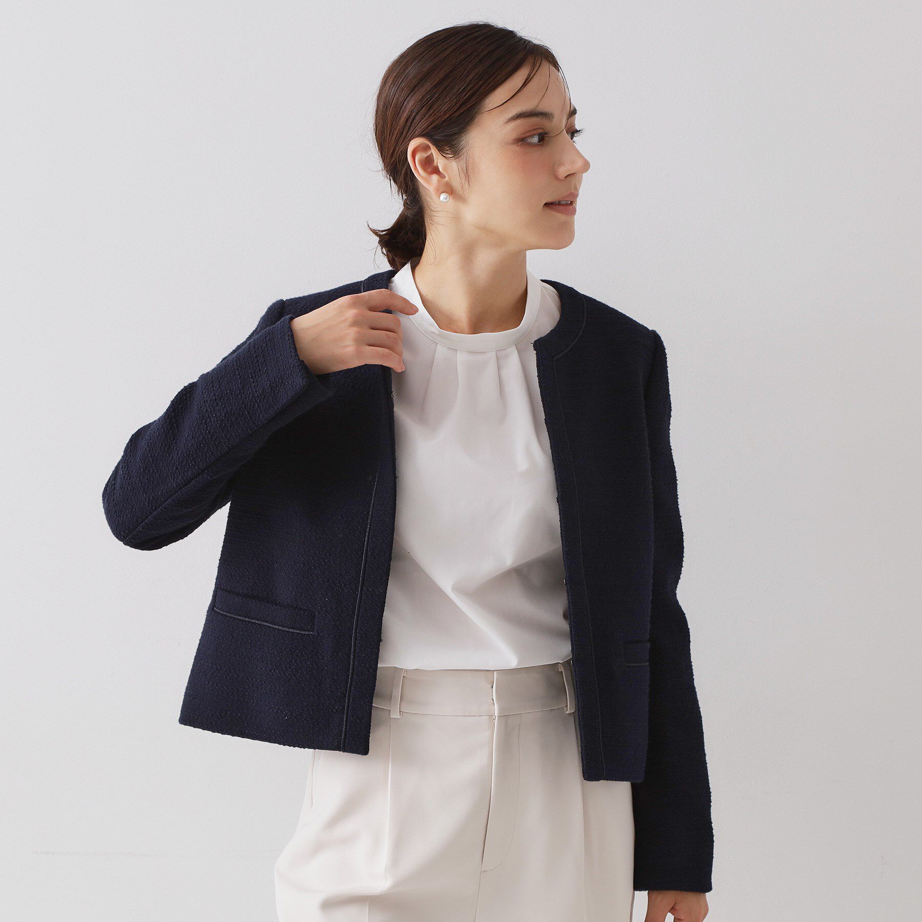OPAQUE.CLIP NAVYDELEGANT(デレガント)社製の素材を使用したツイードジャケット【デザイン】・コンパクトな着丈とシンプルなデザインで、ボトムスを選ばず.. |