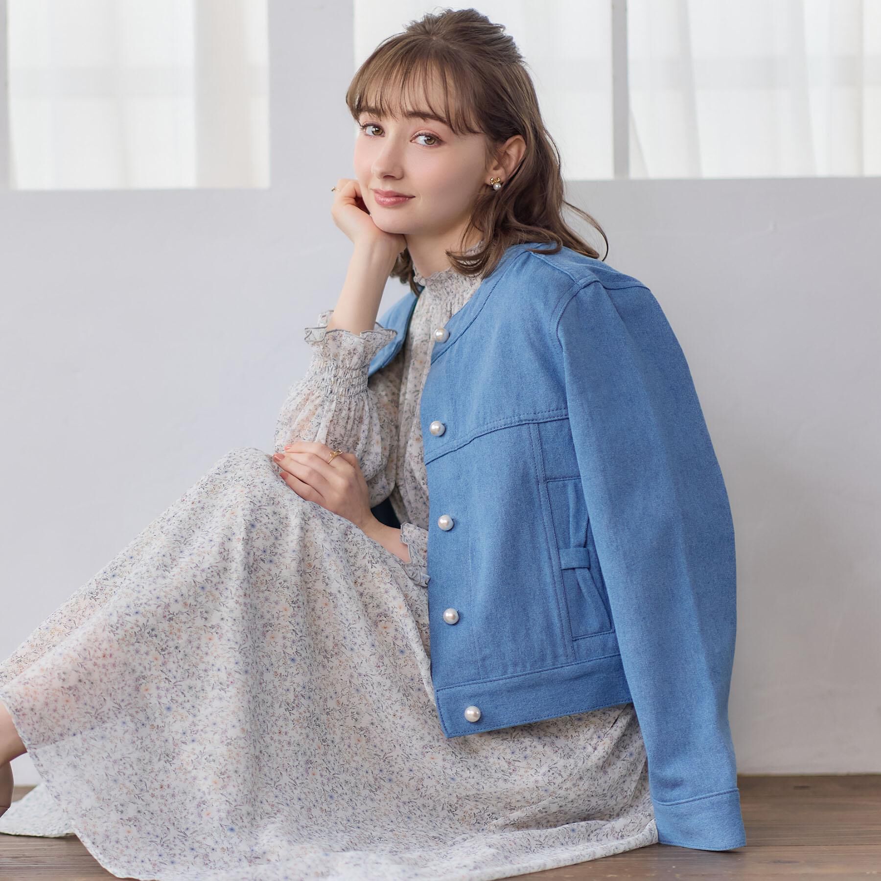 【クチュール ブローチ/Couture brooch】 【洗える・綿100%】パール調ボタン デニムジャケット