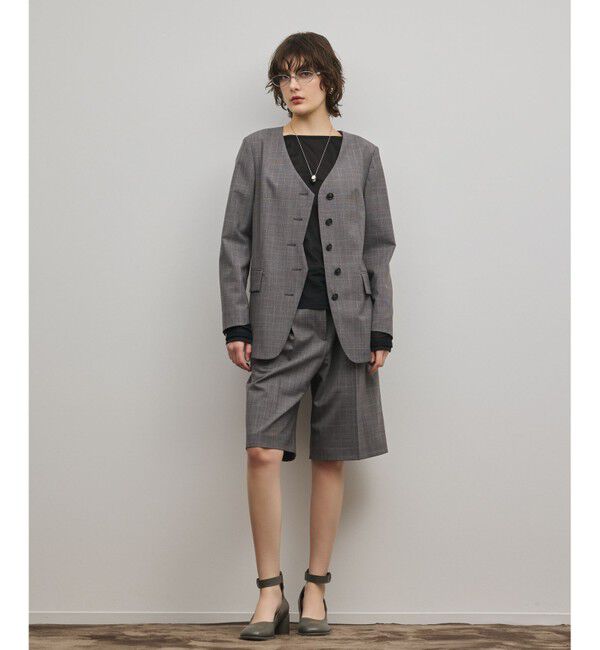 ドライタッチのオックス素材を使用した、マニッシュムード薫るノーカラージャケット。ノーカラー&ボタンレスのスマートなフロントに、女性の体が美し.. |
