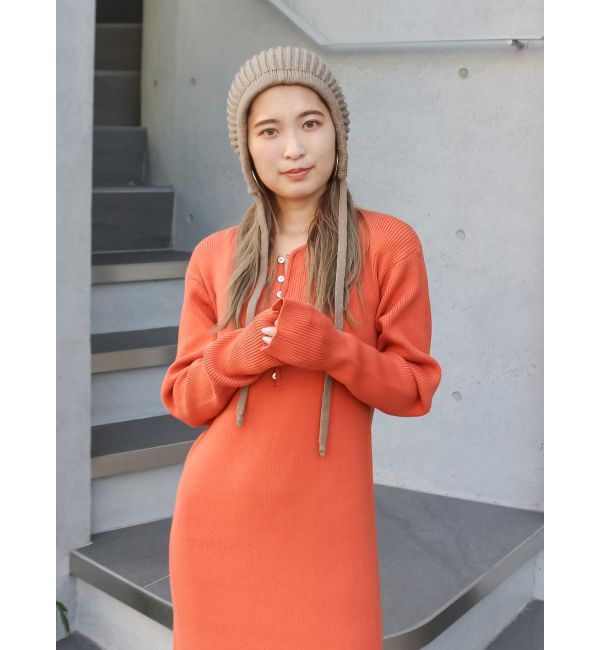 ■耳まですっぽり隠れる形がかわいい紐付きのニット帽。ざっくりした編地がカジュアルな印象でお使いいただけます。あえて少し大きめのサイズ感で小顔効果があ.. |
